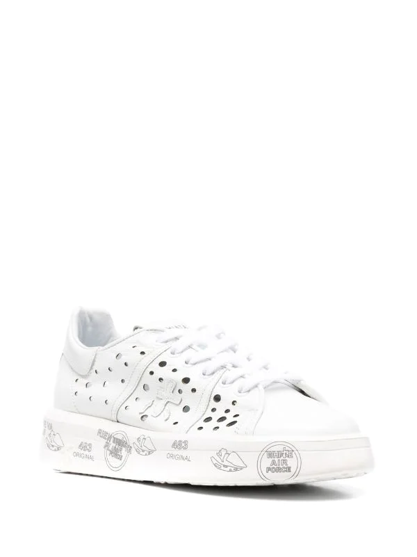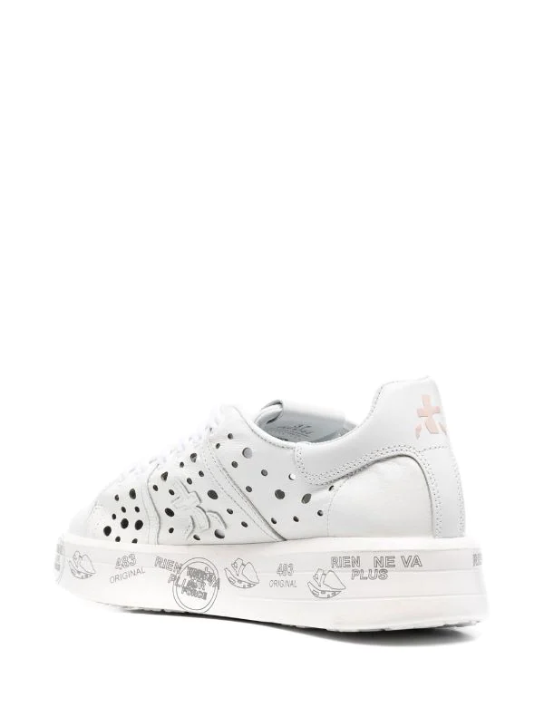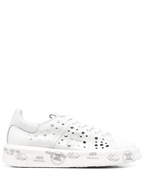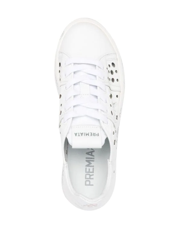 Bestickt, runde Kappe, Schnürung vorne, Logo-Patch an der Zunge, Logo-Prägung im Fußbett, Pleateausohle. Farbe: Weiß. Material: Leder.