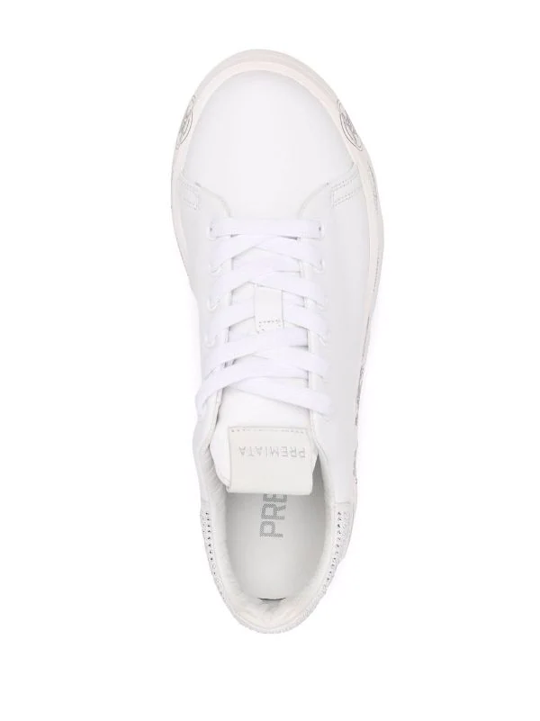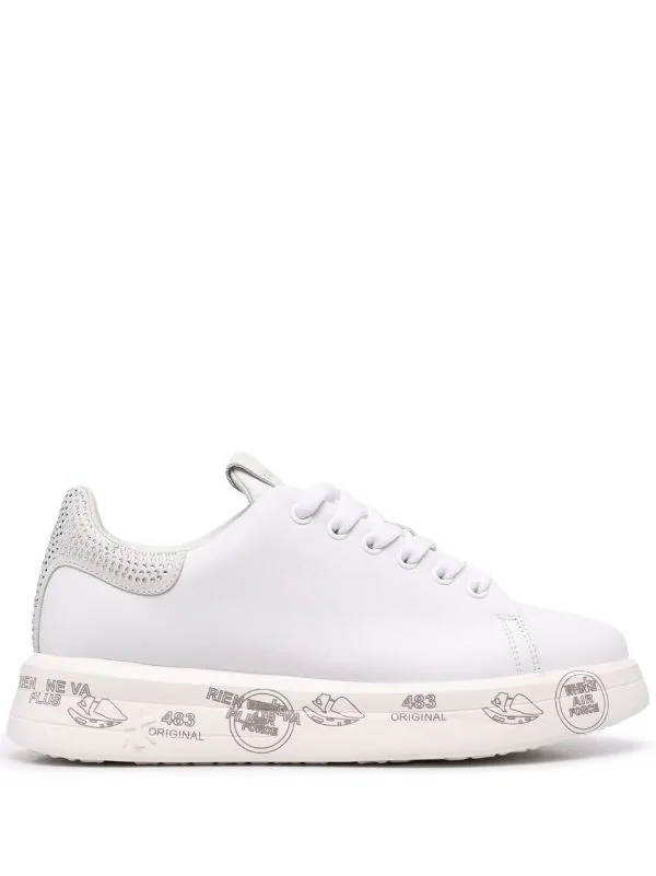Kristallverzierung, flache Gummisohle, Schnürung vorne, runde Kappe. Farbe: Weiß. Material: Leder.