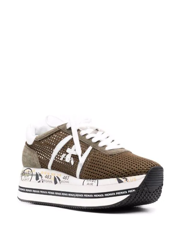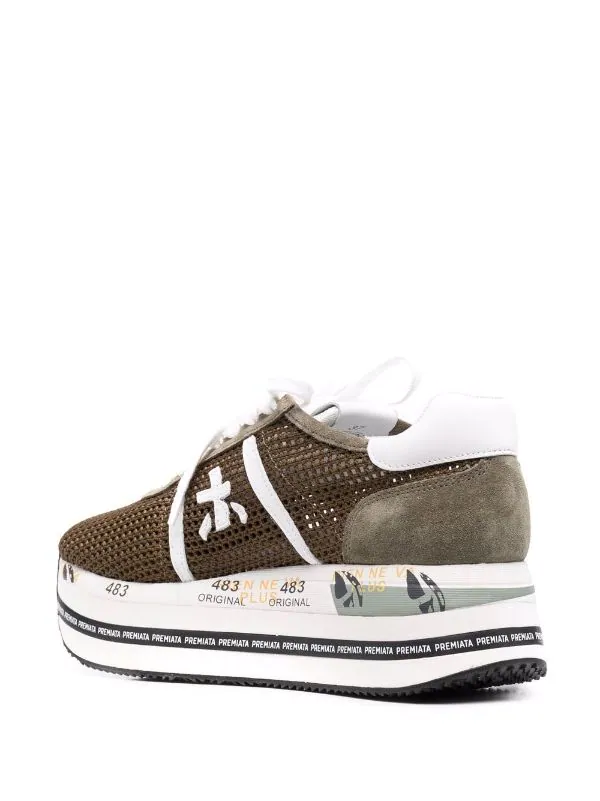Perforiert, Logo-Patch an der Zunge, Logo-Patch an der Seite, Logo-Prägung im Fußbett, Schnürung vorne, runde Kappe, Sohle mit Logo, Pleateausohle.