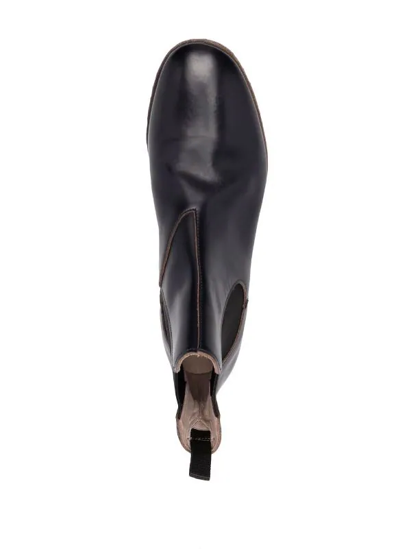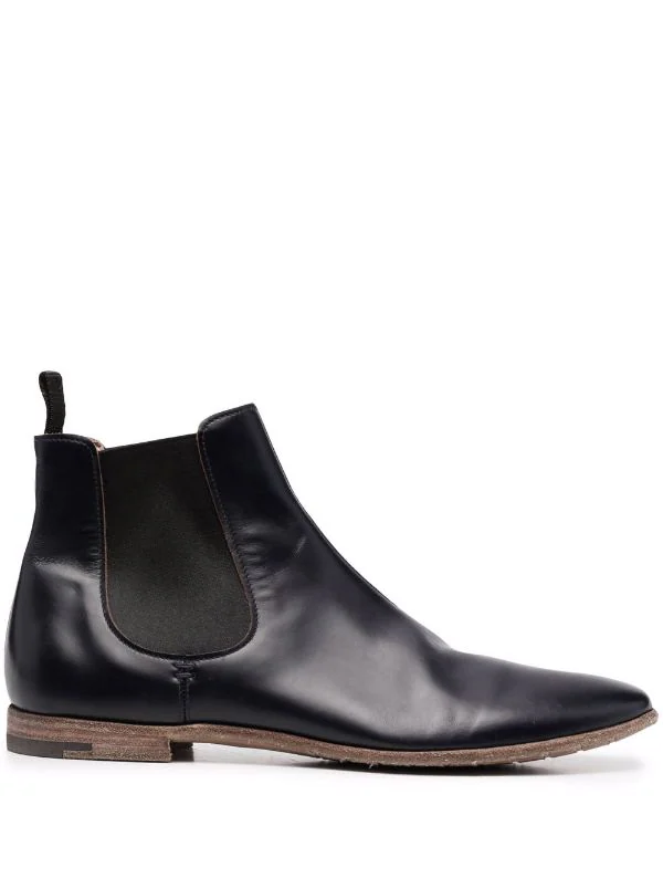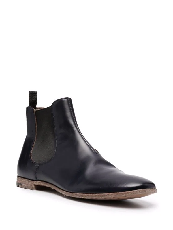 Stretcheinsätze an den Seiten, mandelförmige Kappe, Lasche an der Ferse, ohne Verschluss, Logo-Prägung im Fußbett, flache Ledersohle. Material: Kalbsleder.
