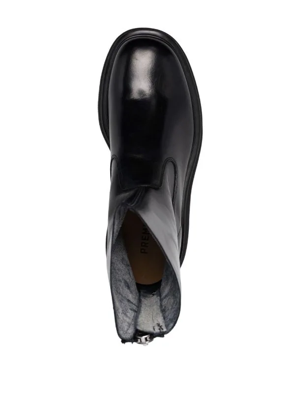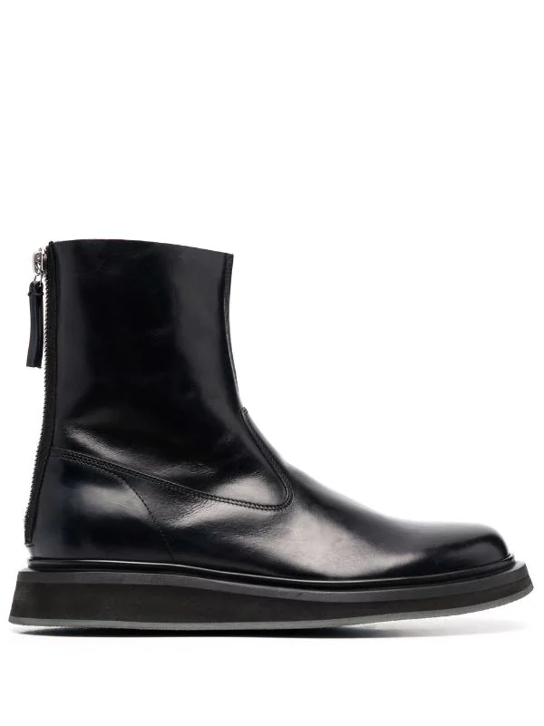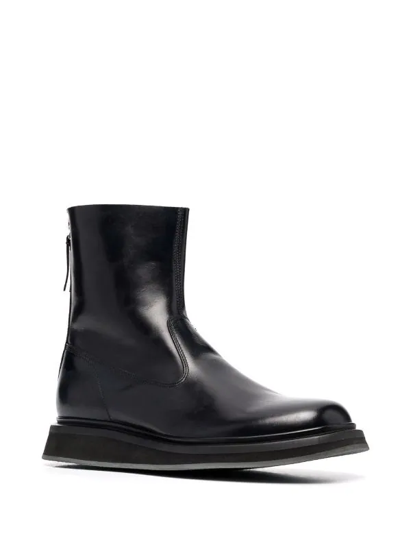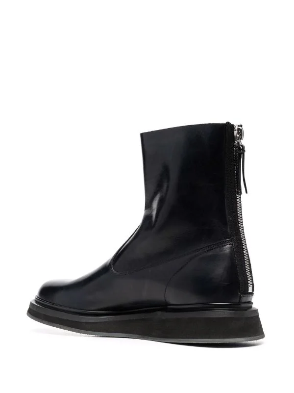 Reißverschluss hinten, Lederinnensohle mit Logo-Prägung, runde Kappe, knöchelhoch, flache Gummisohle. Farbe: Schwarz. Material: Leder.