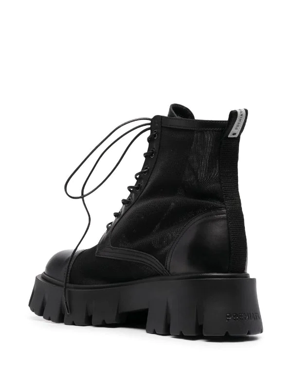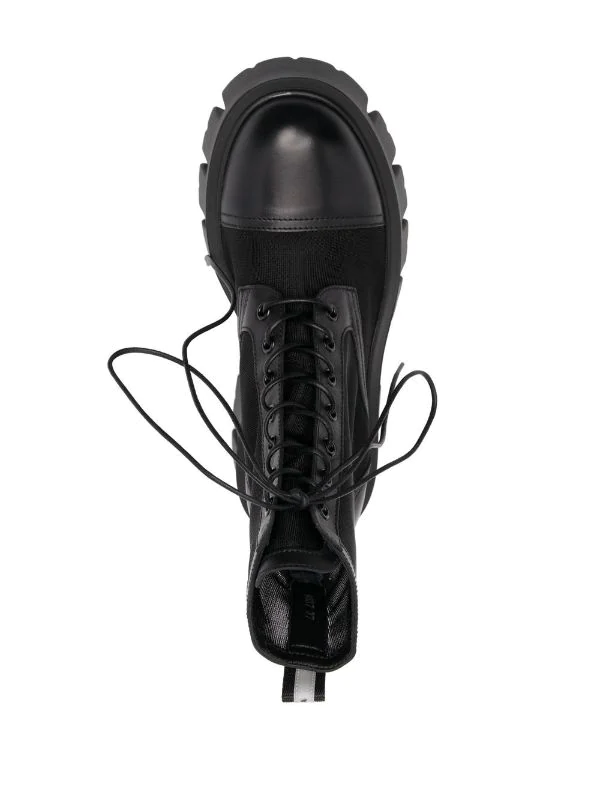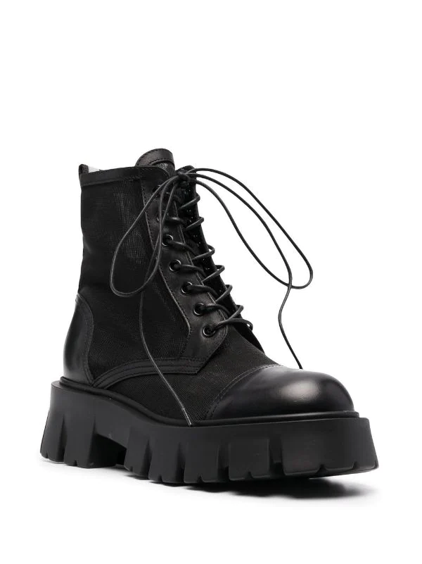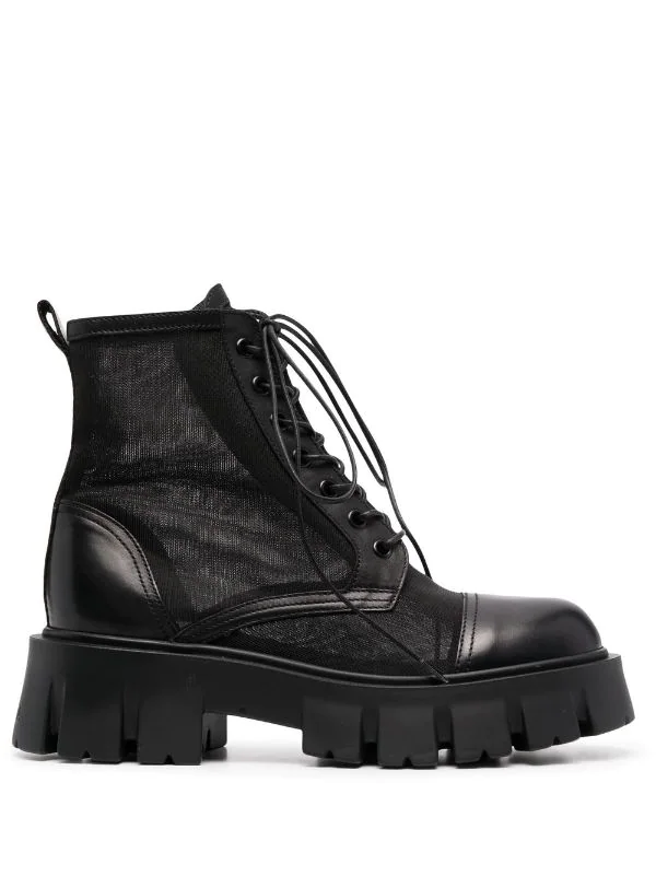 Schnürung vorne, Lasche an der Ferse, klobige Gummisohle. Farbe: Schwarz. Material: Leder.