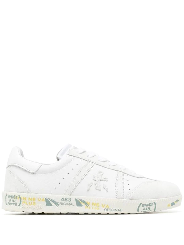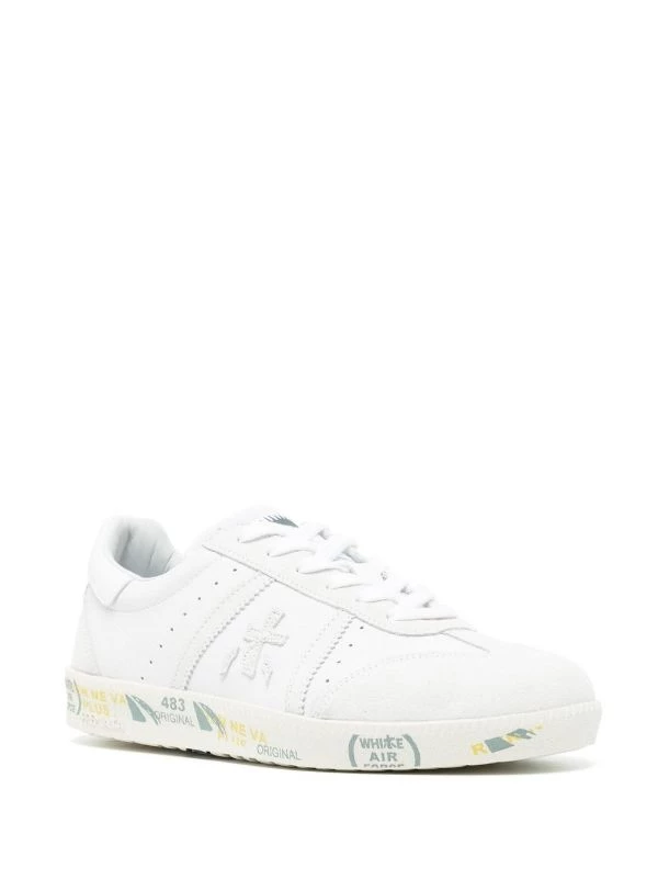 Bonnie panelled low-top sneakers from PREMIATA featuring light grey, off-white, forest green, calf leather, panelled design, round toe, front lace-up fastening, branded insole and flat rubber sole.