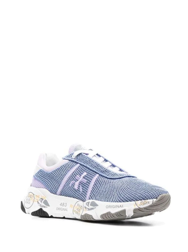 Purpur, Weiß, Leder, Mesh-Details, Logo-Prägung an der Seite, Logo-Patch an der Zunge, runde Kappe, Schnürung vorne, Logo-Prägung im Fußbett, klobige Gummisohle.