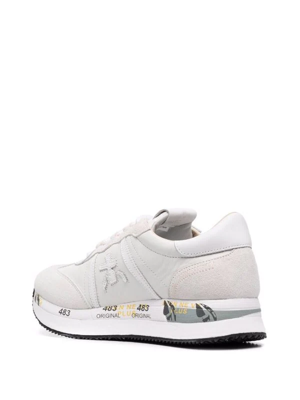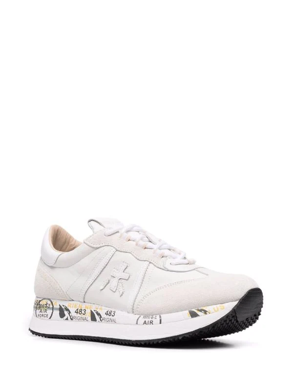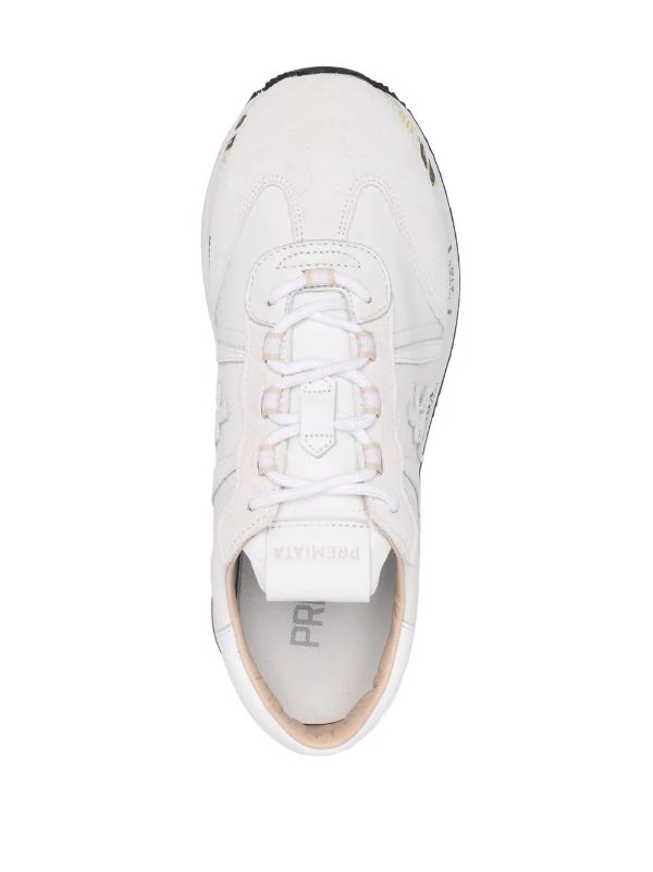 Schnürung vorne, flache Gummisohle, Logo-Patch an der Seite, runde Kappe. Farbe: Weiß.