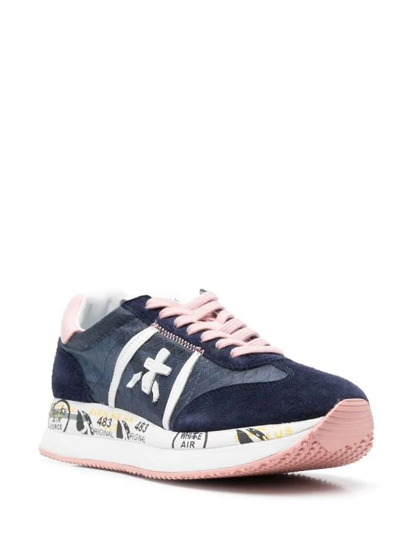 Marineblau, Leder, Kontrastdetails, Logo-Patch vorne, Logo-Prägung im Fußbett, runde Kappe, Schnürung vorne, flache Gummisohle.