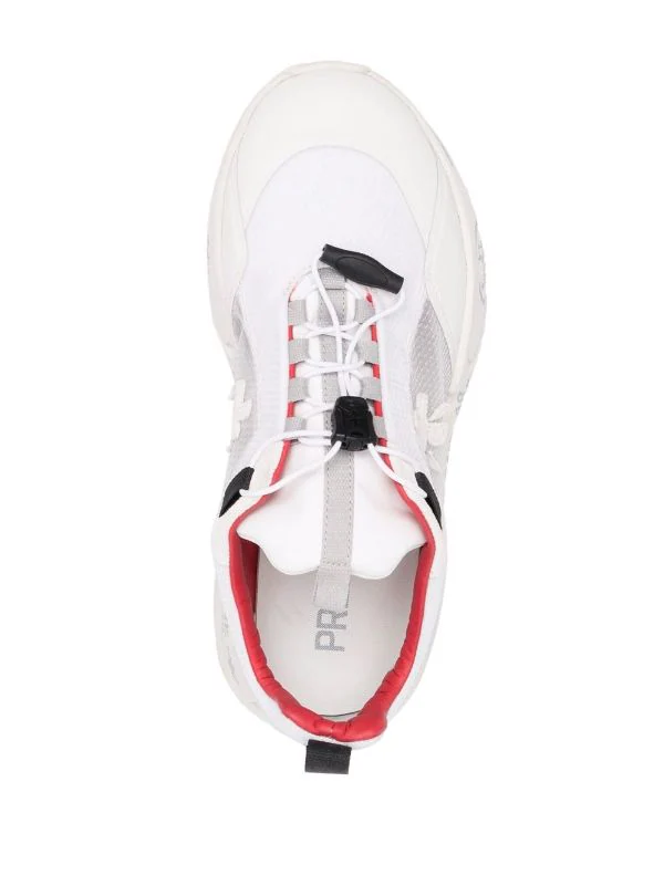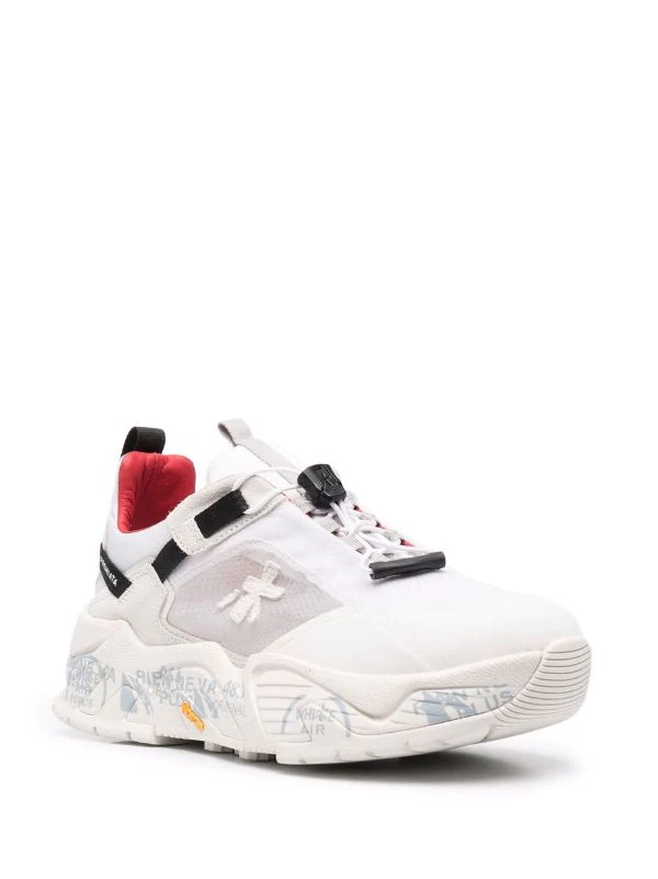 Kontrastdetails, Logo-Patch an der Seite, seitlicher Logo-Print, Kordelzug-Detail, doppelte Lasche, Logo-Prägung im Fußbett, klobige Sohle.