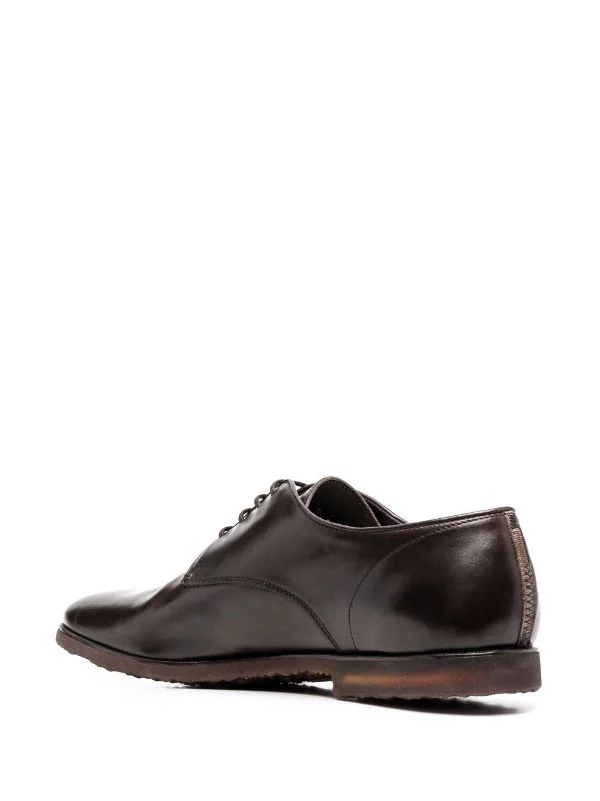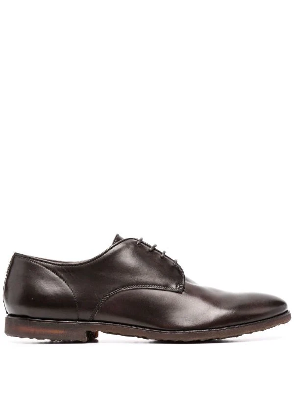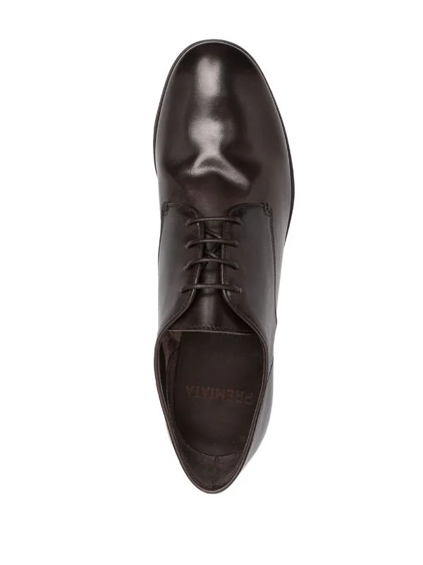 Hochglanz-Finish, Schnürung vorne, runde Kappe, Logo-Prägung im Fußbett, flache Gummisohle.