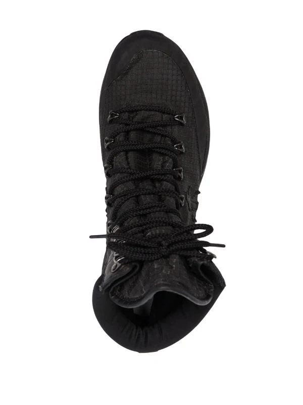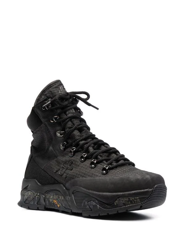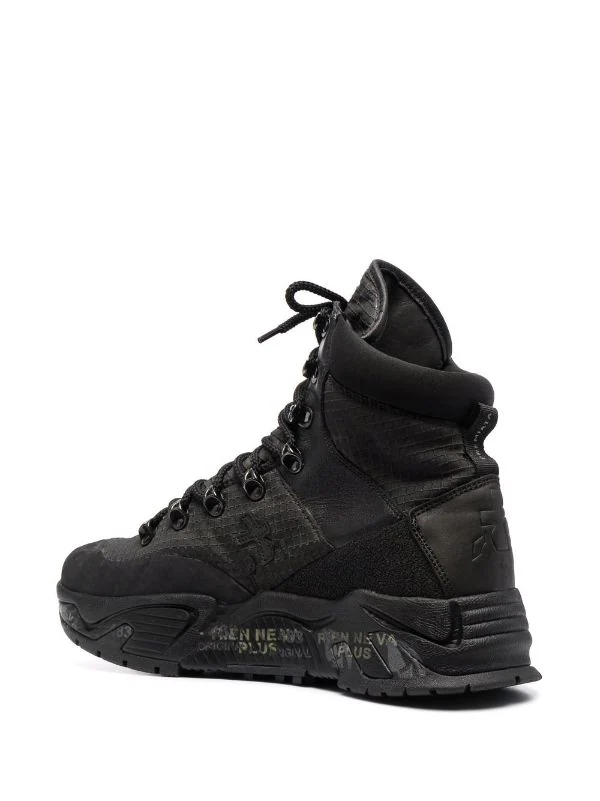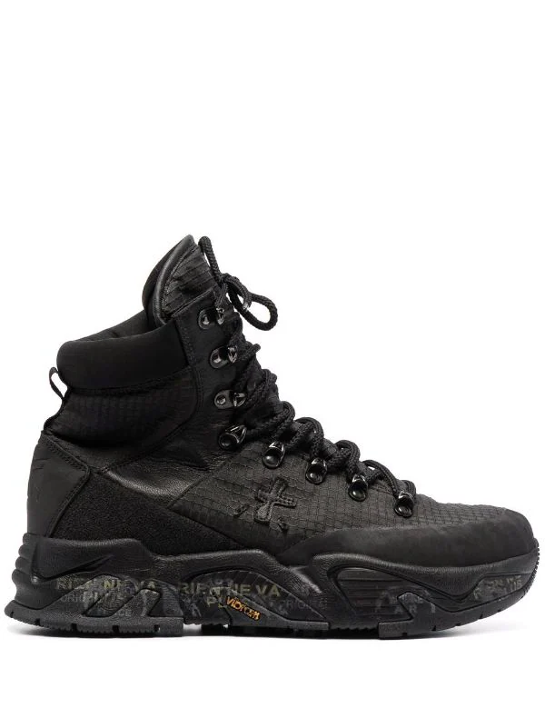 Logo-Patch an der Seite, runde Kappe, Schnürung vorne, Logo-Prägung im Fußbett, klobige Gummisohle. Farbe: Schwarz. Material: Leder.