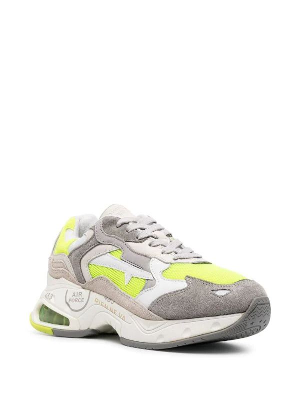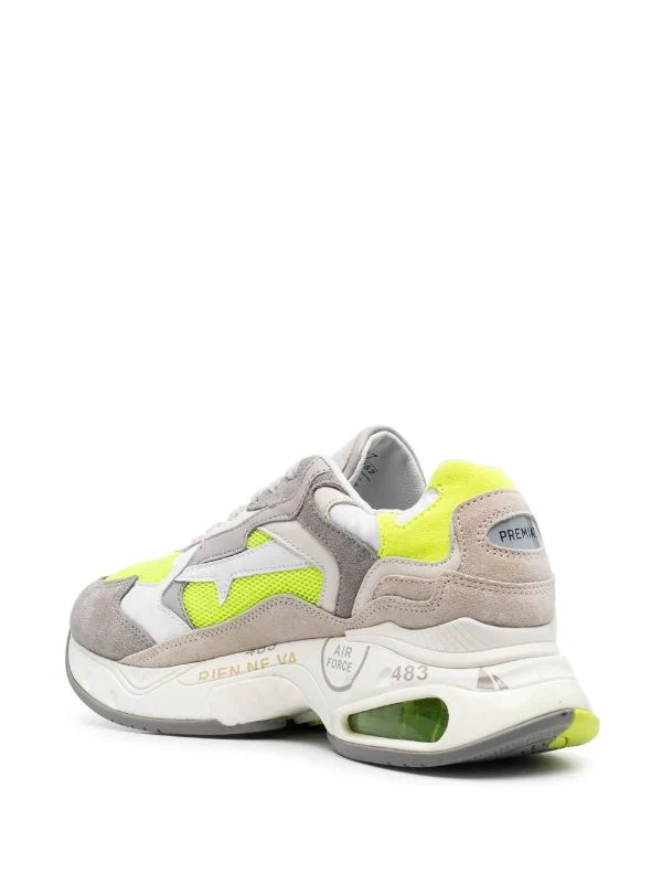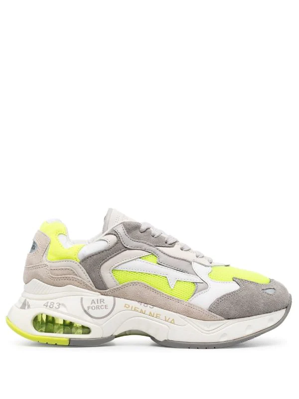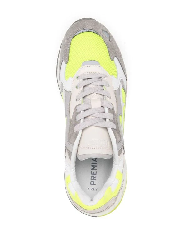 Grau, Fluo Gelb, Kontrastdetails, Schnürung vorne, runde Kappe, klobige Gummisohle. Material: Leder.