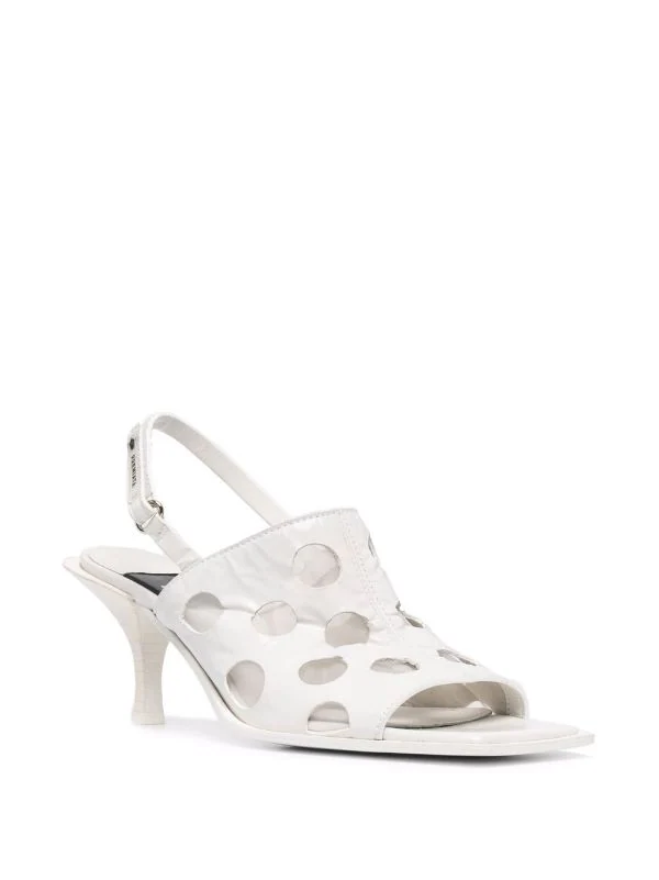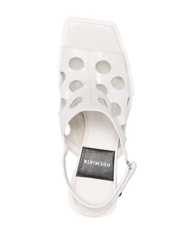 Einsätze mit geometrischem Muster, Cut-Outs, zehenfrei, niedriger Absatz, Slingback-Riemen mit Schnalle. Farbe: Weiß. Material: Lammleder.