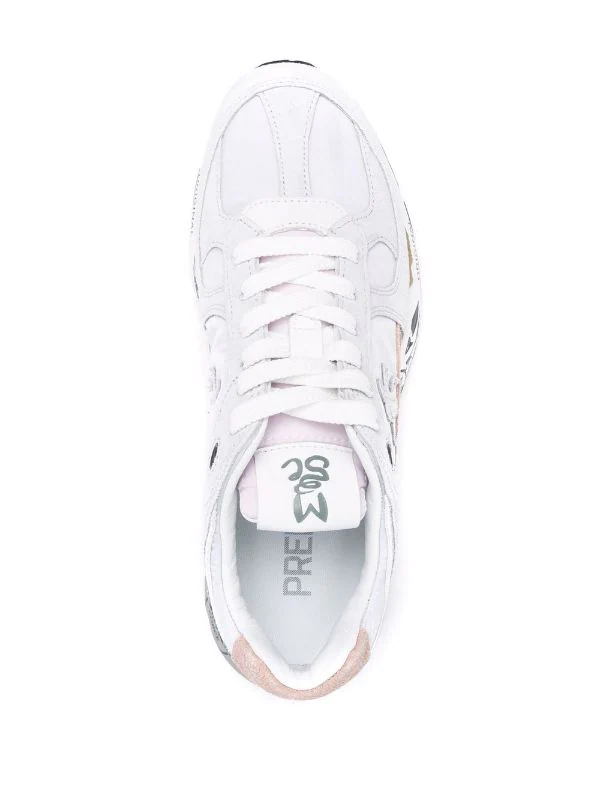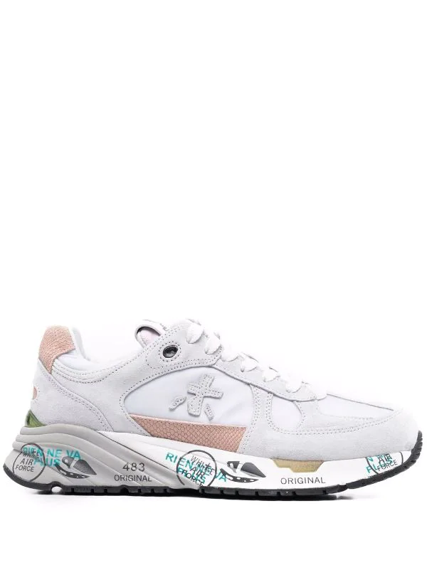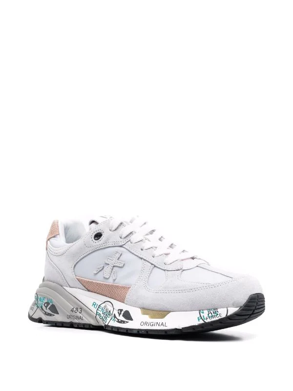 Einsätze mit geometrischem Muster, Logo-Patch an der Seite, kontrastierende Fersenkappe, Logo-Patch an der Zunge, Schnürung vorne, runde Kappe, klobige Gummisohle, Slogan-Print.