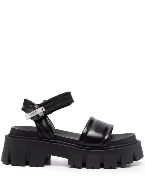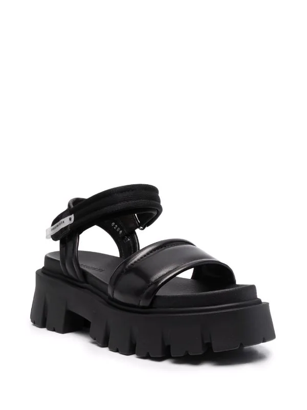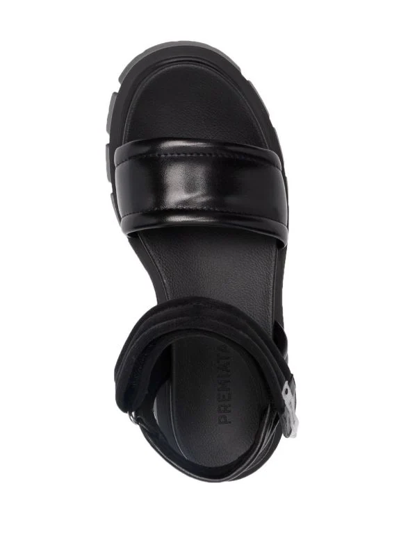Einzelner Zehenriemen, zehenfrei, Profilsohle aus Gummi, Klettverschluss am Knöchel. Farbe: Schwarz. Material: Leder.