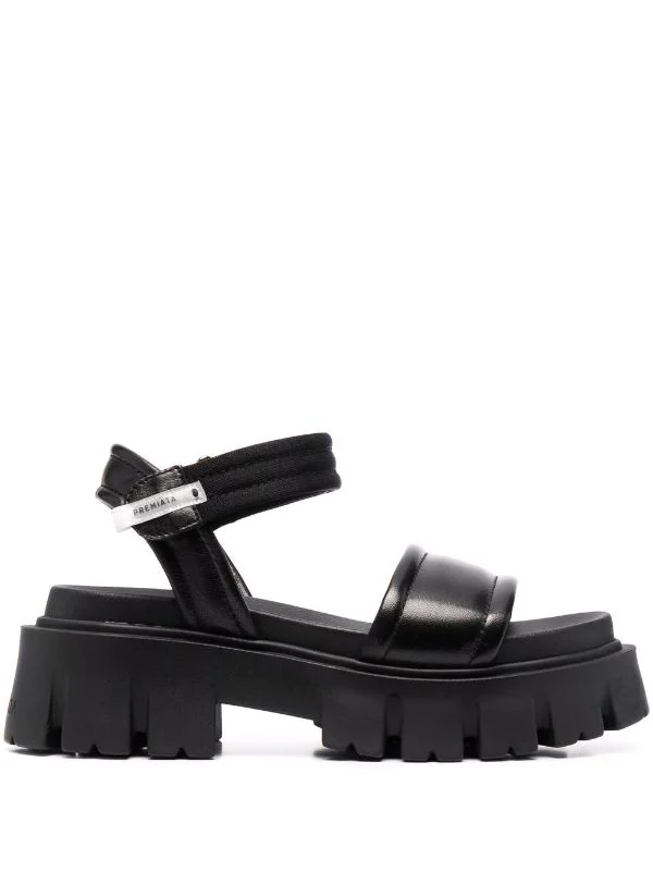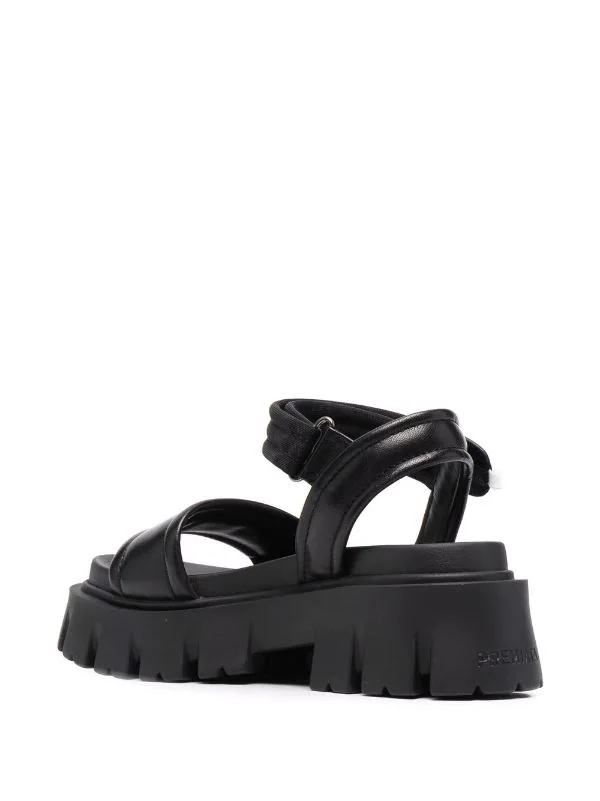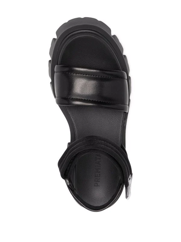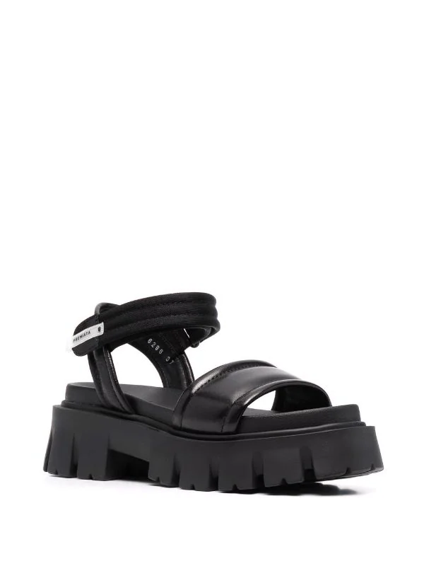 Logo-Etikett, Klettverschluss am Knöchel, zehenfrei, Lederinnensohle mit Logo-Prägung, breite Profilsohle aus Gummi. Farbe: Schwarz. Material: Leder.