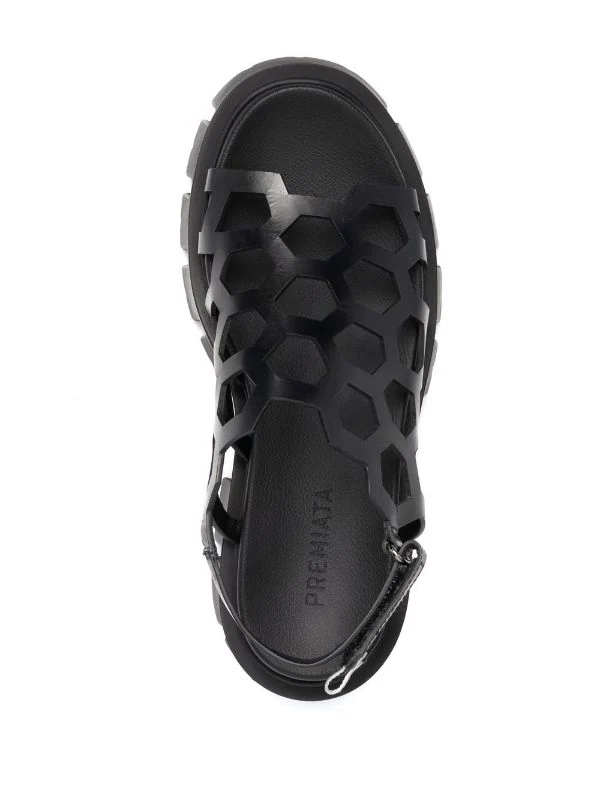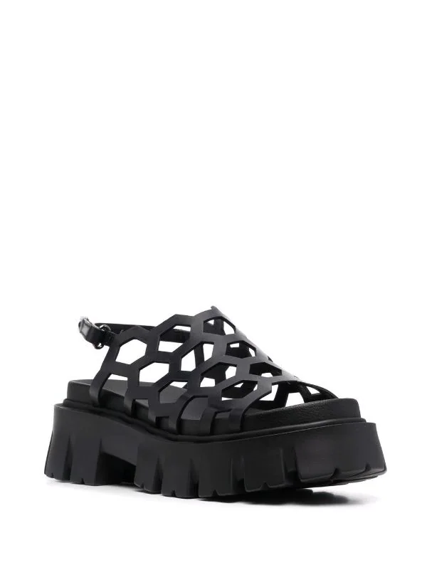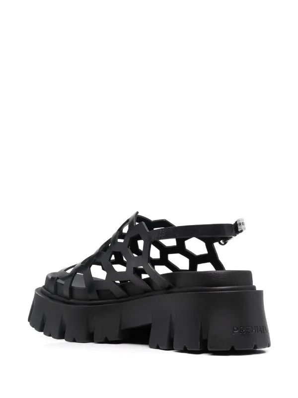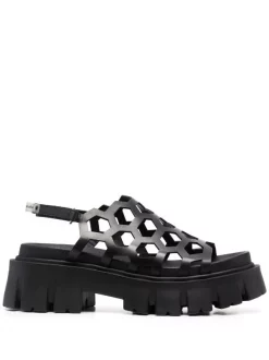 Laser-Cuts, Logo-Patch hinten, zehenfrei, Knöchelriemen, mittelhoher Blockabsatz, Logo-Prägung im Fußbett, Profilsohle aus Gummi. Farbe: Schwarz.