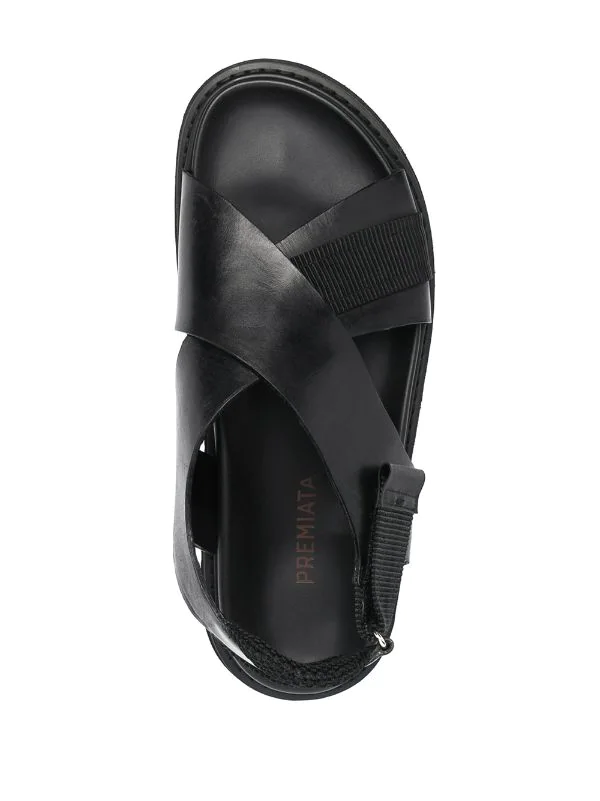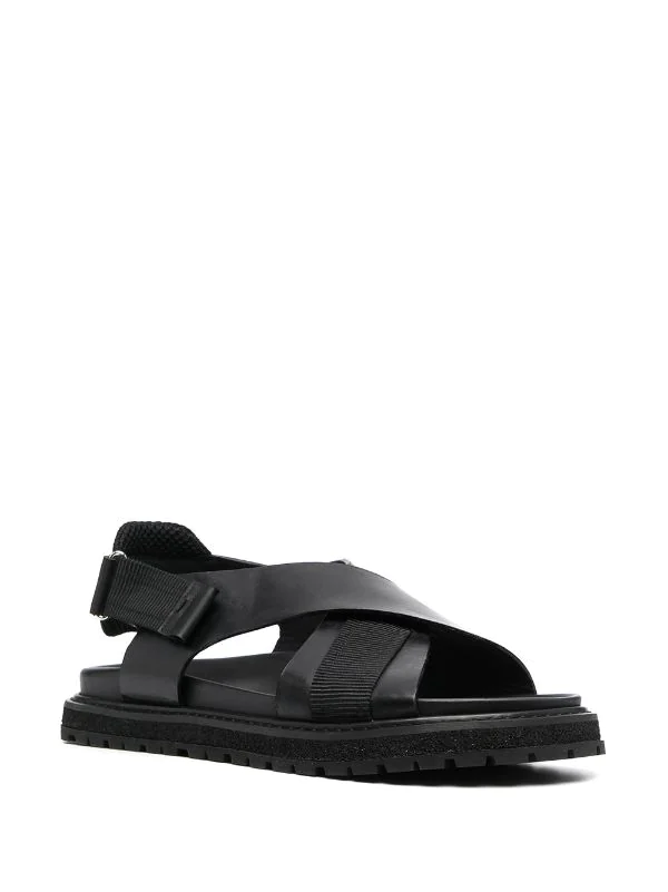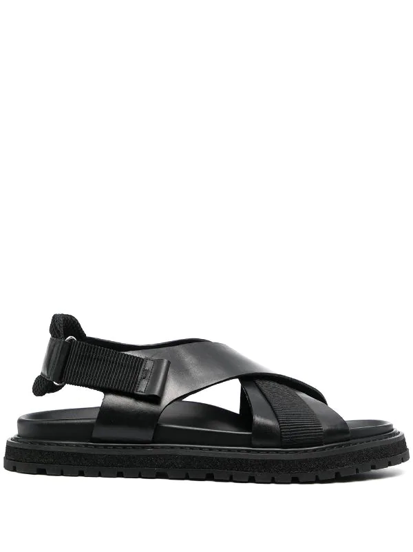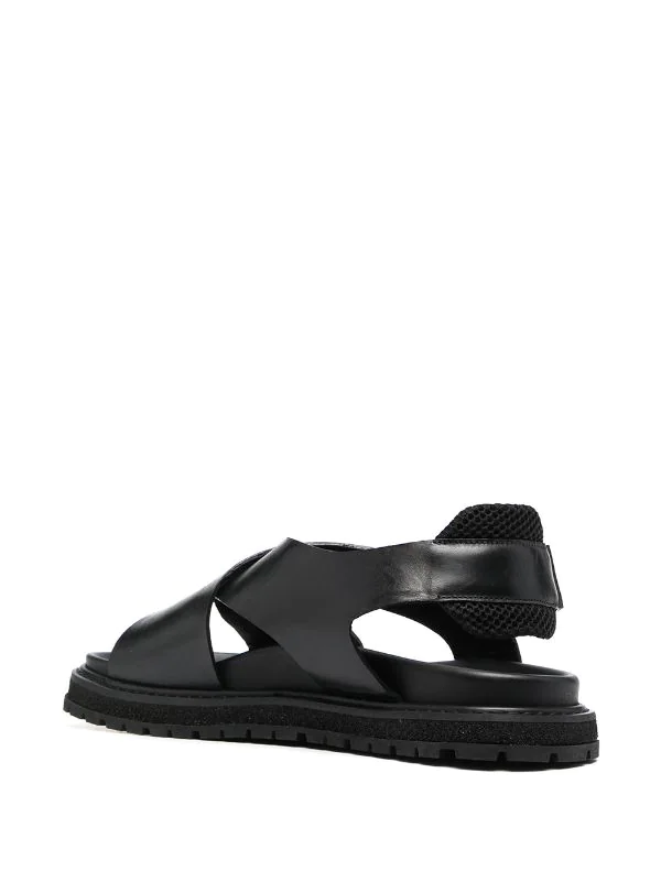 Überkreuzte Riemen, Logo-Prägung im Fußbett, zehenfrei, Klettverschluss am Knöchel, geriffelte Gummisohle. Farbe: Schwarz. Material: Kalbsleder.