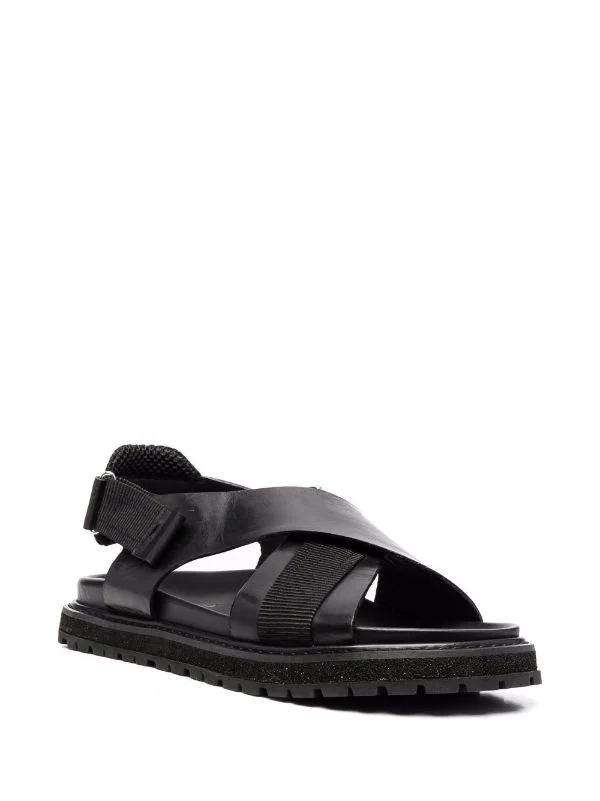 Überkreuzte Riemen, zehenfrei, Klettverschluss am Knöchel, gefütterter Schaft, geformtes Fußbett, Logo-Prägung im Fußbett, breite Profilsohle aus Gummi. Farbe: Schwarz. Material: Kalbsleder.