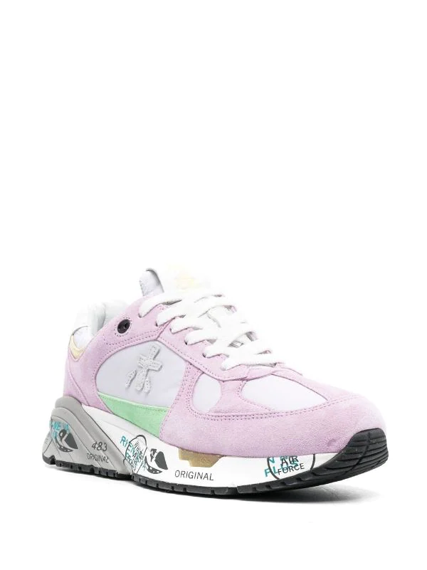 Kontrastdetails, Logo-Patch an der Seite, Logo-Patch an der Zunge, runde Kappe, Schnürung vorne, Logo-Prägung im Fußbett, klobige Gummisohle.