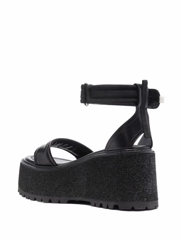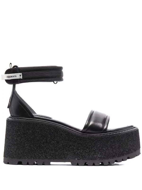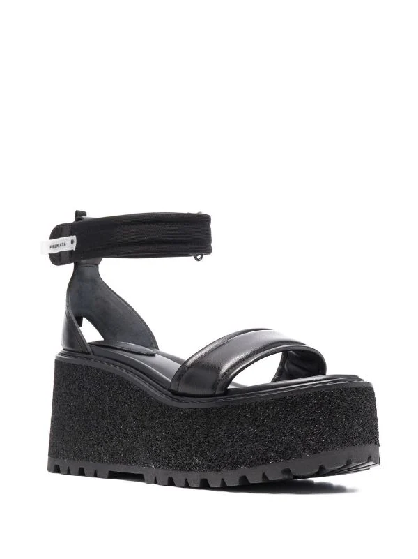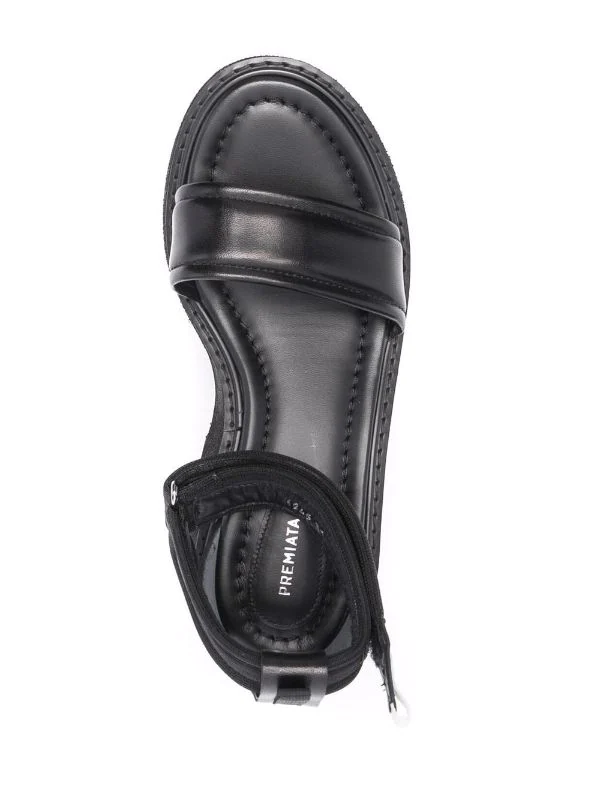Bänderdetails, Schnallenverschluss am Knöchel, Logo-Prägung im Fußbett, Pleateausohle. Farbe: Schwarz. Material: Leder.