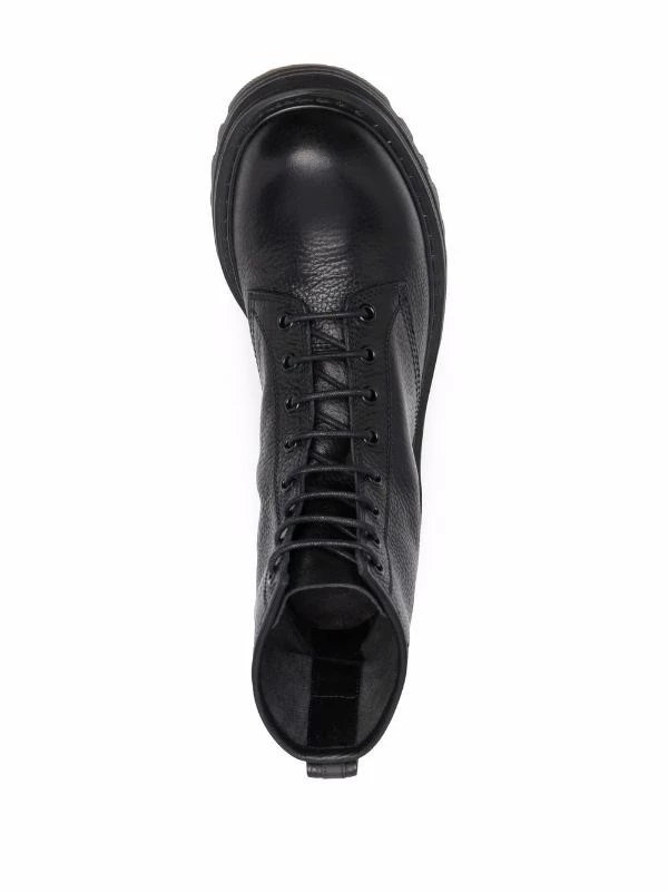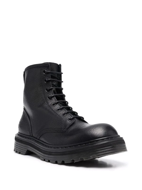 Schnürung vorne, Lasche an der Ferse, runde Kappe, knöchelhoch, flache Gummisohle. Farbe: Schwarz. Material: Leder.