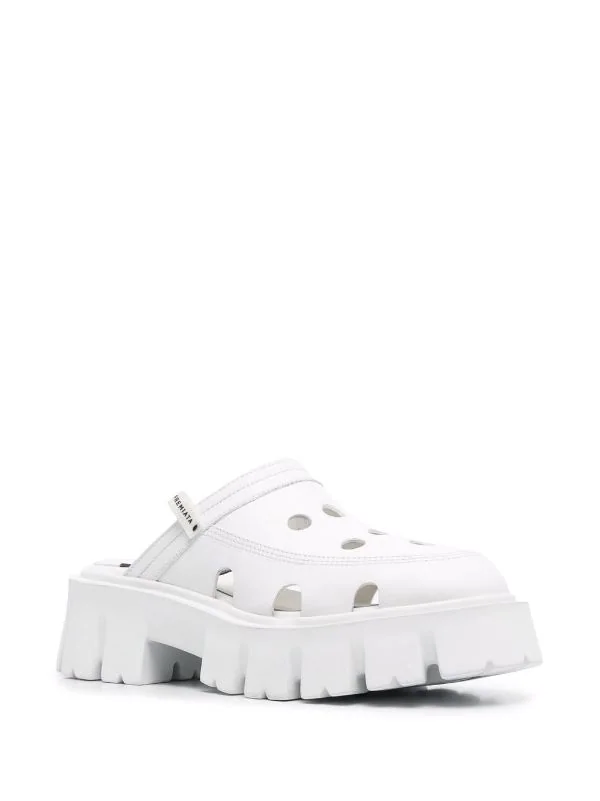 Ohne Verschluss, perforiert, runde Kappe, Logo-Prägung im Fußbett, geriffelte Gummisohle. Farbe: Weiß.