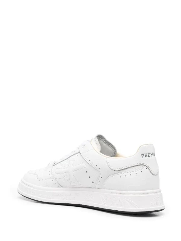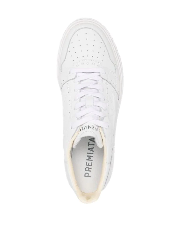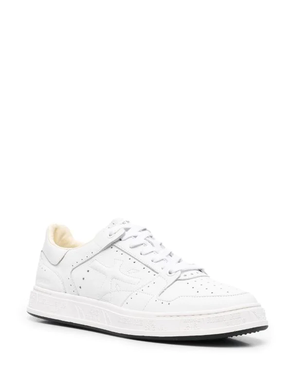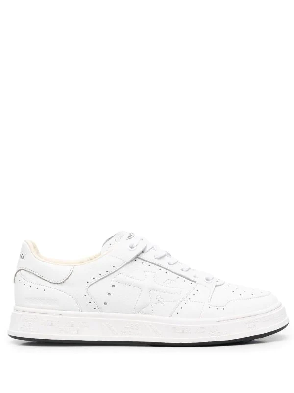 Weiß, Leder, perforiert, Logo an der Fersenkappe, Schnürung vorne, runde Kappe, flache Gummisohle.