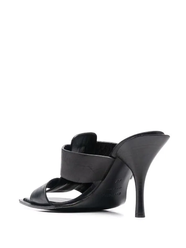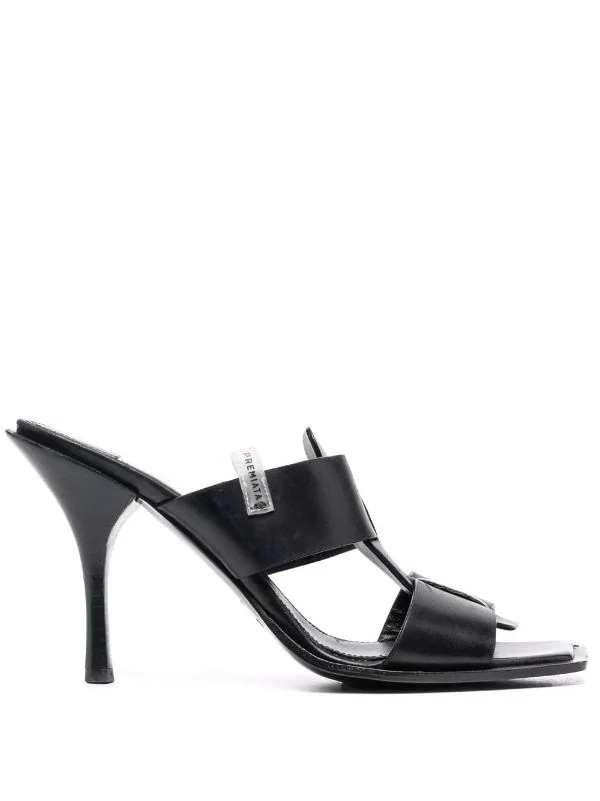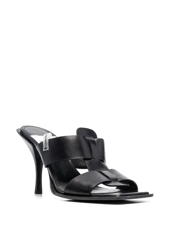 Doppelriemen, zehenfrei, ohne Verschluss, hoher Absatz, Logo-Prägung im Fußbett, Gummisohle. Farbe: Schwarz.