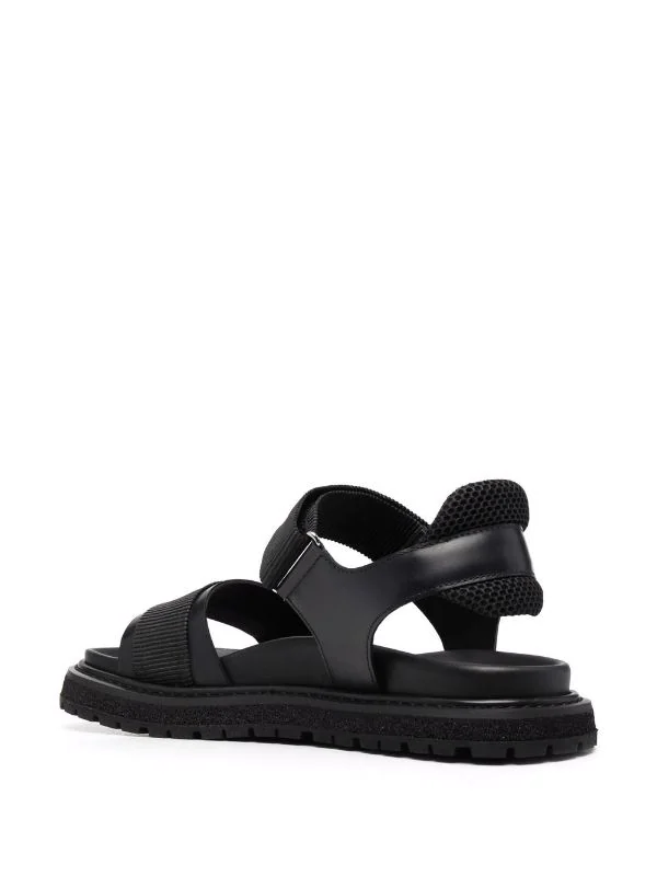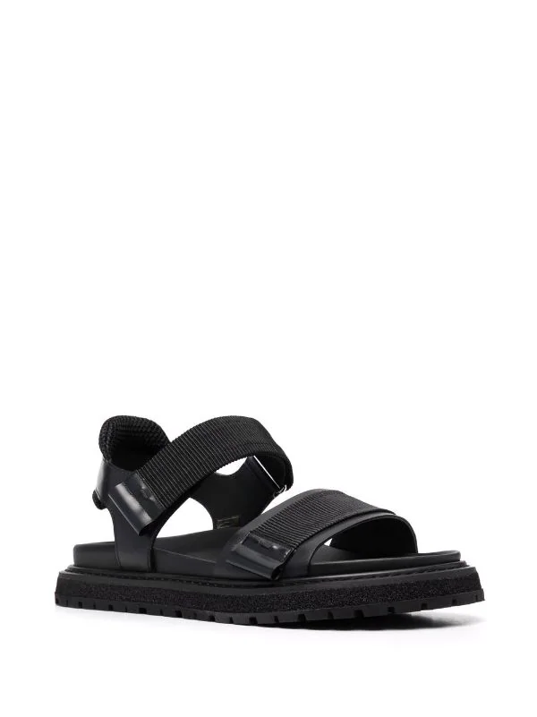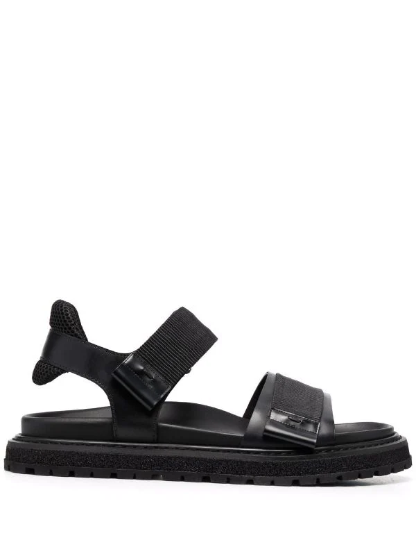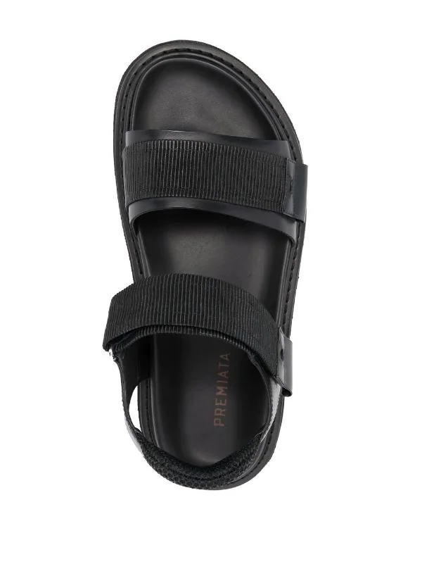 Doppelriemen, Slingback-Riemen, Klettverschluss, Lederinnensohle mit Logo-Prägung, geformtes Fußbett, zehenfrei, flache Gummisohle. Farbe: Schwarz. Material: Leder.