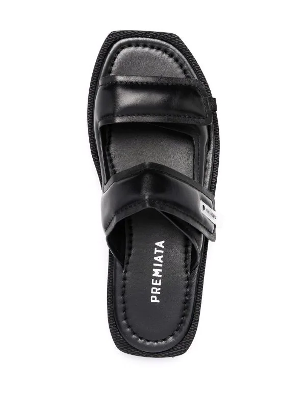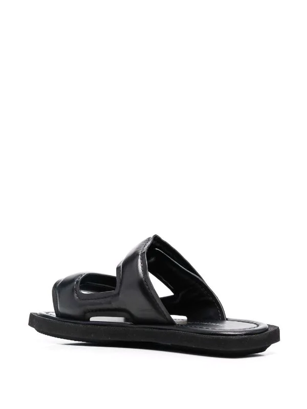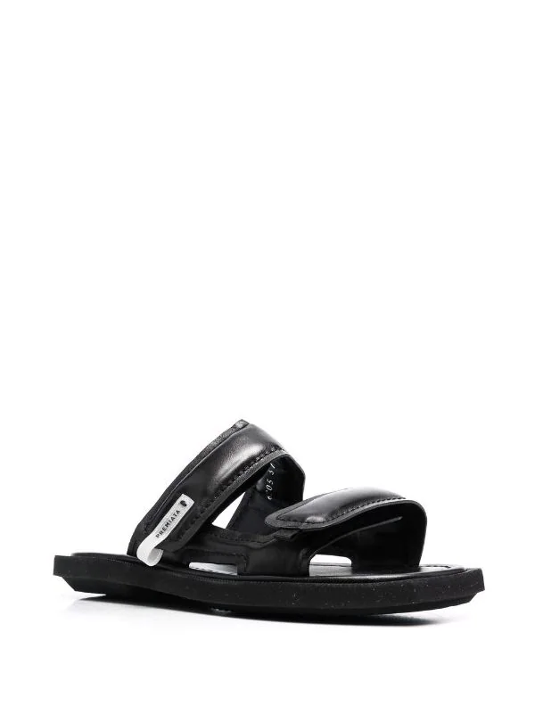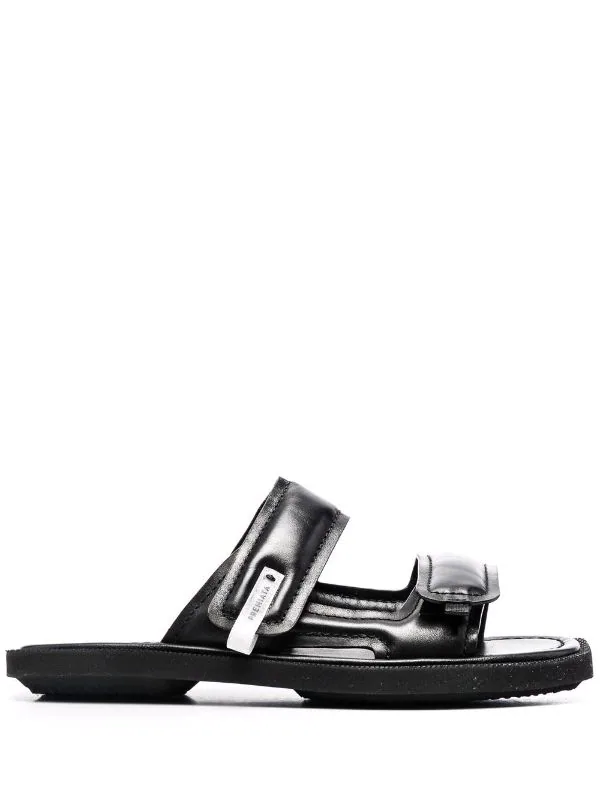 Ohne Verschluss, Logo-Patch an der Seite, Klettverschluss vorne, zehenfrei, Logo-Prägung im Fußbett, flache Gummisohle. Farbe: Schwarz.