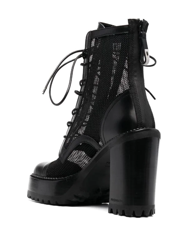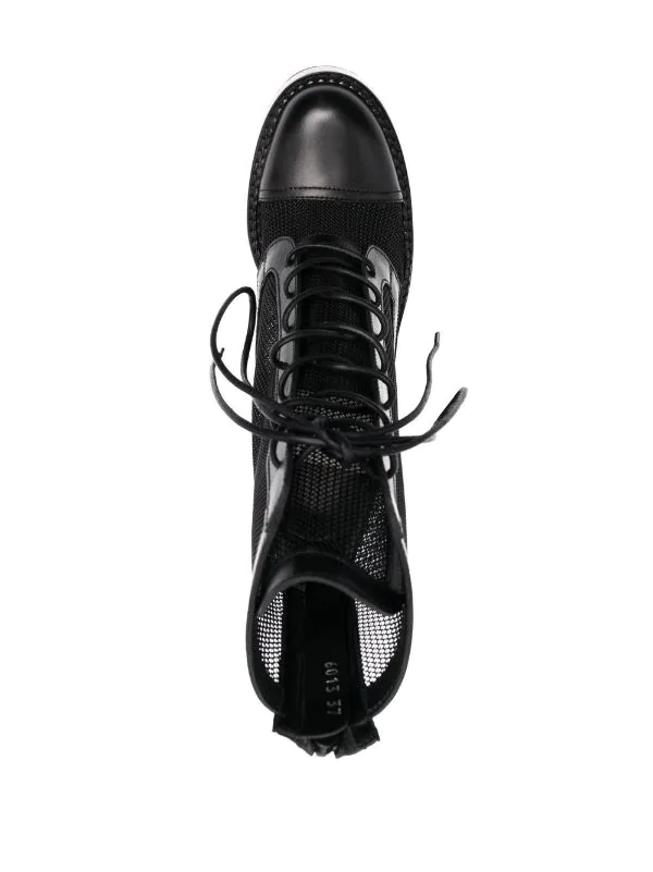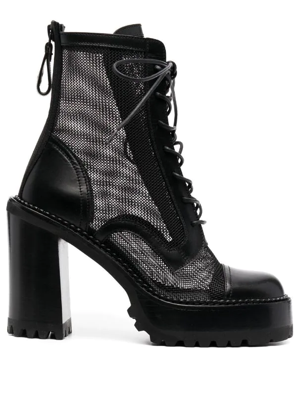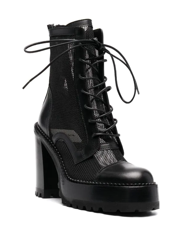Schwarz, Leder, Mesh-Einsätze, seitliche Logo-Prägung, Schnürung vorne, Reißverschluss hinten, mandelförmige Kappe, hoher Absatz, Logo-Prägung im Fußbett, Gummisohle.