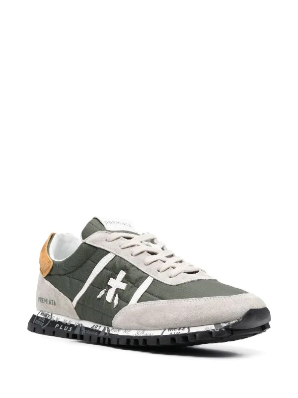 Grün, runde Kappe, Schnürung vorne, Logo-Patch an der Zunge, Logo-Prägung im Fußbett, Logo an der Fersenkappe, geriffelte Gummisohle, Kontrastdetails.