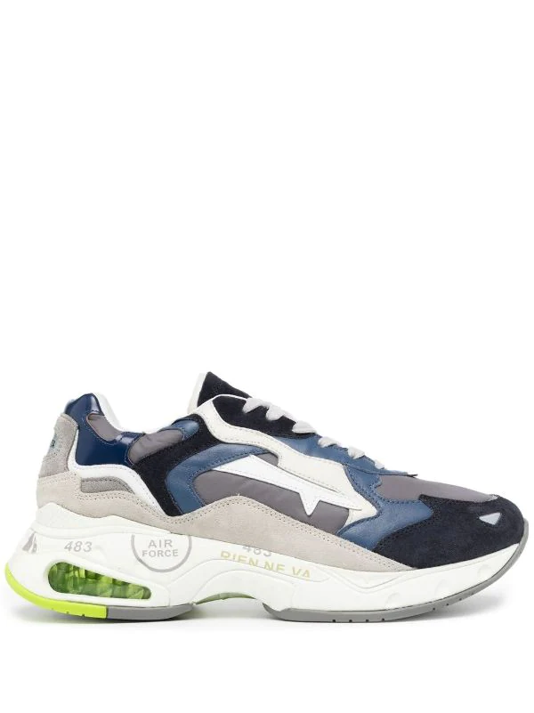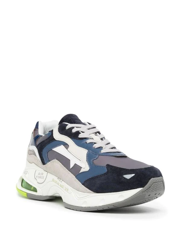 Colour-Block-Design, Logo an der Fersenkappe, Logo-Prägung an der Zunge, Sohle mit Logo, transparenter Einsatz, Schnürung vorne, Logo-Prägung im Fußbett, runde Kappe, klobige Gummisohle. Material: Leder.