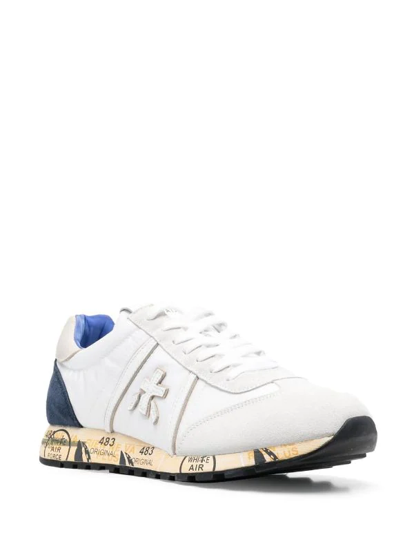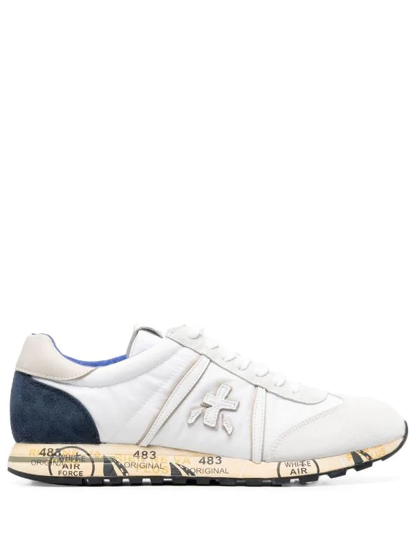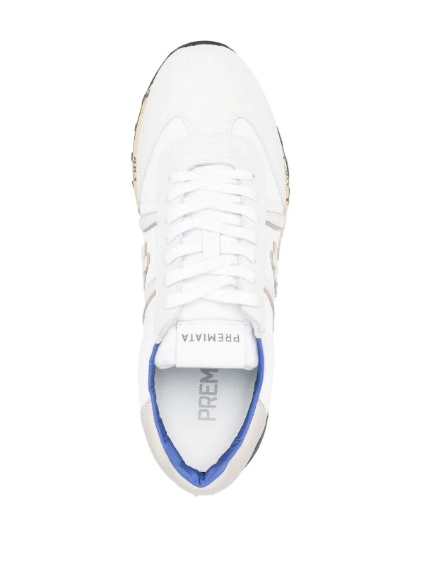 Weiß, Leder, Logo-Patch an der Zunge, Logo-Patch an der Seite, runde Kappe, Schnürung vorne, kontrastierende Fersenkappe, geriffelte Gummisohle.