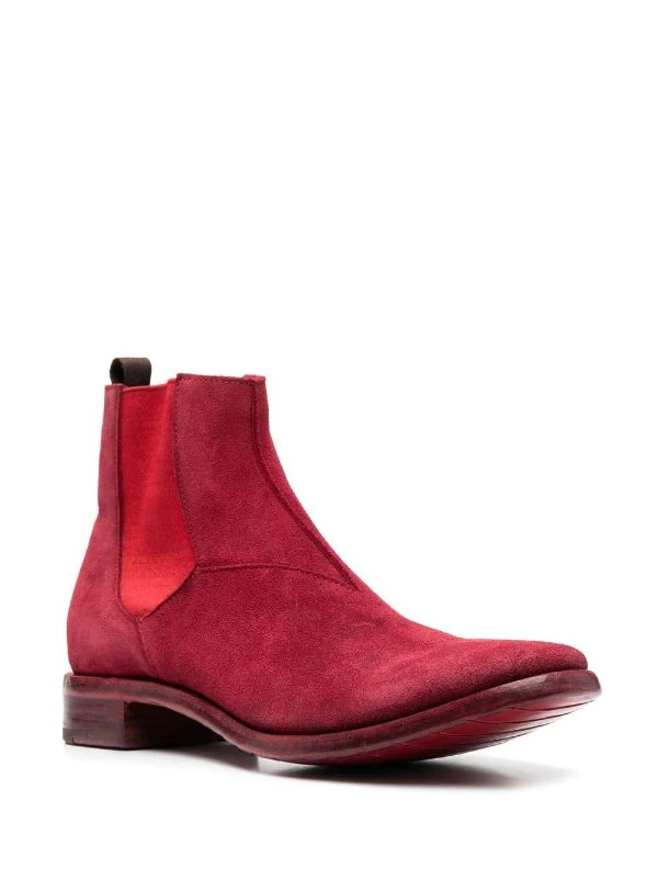 Weinrot, Kalbsleder, Kalbswildleder, Futter aus Leder, Stretcheinsätze an den Seiten, mandelförmige Kappe, ohne Verschluss, niedriger Absatz.
