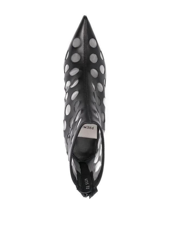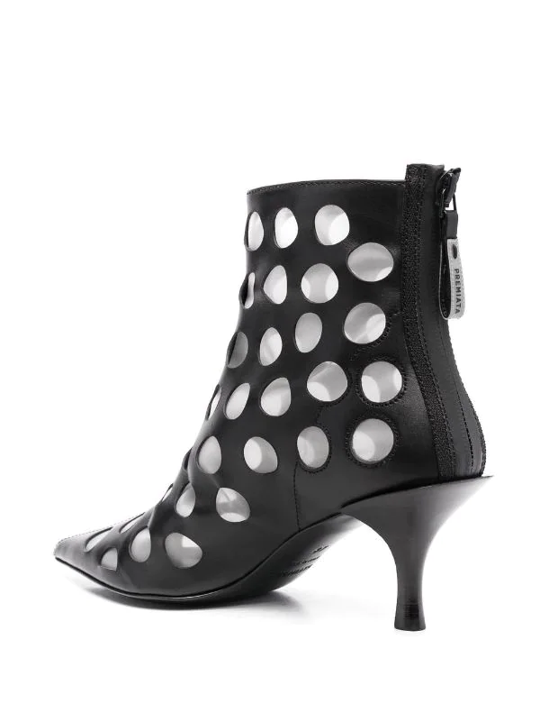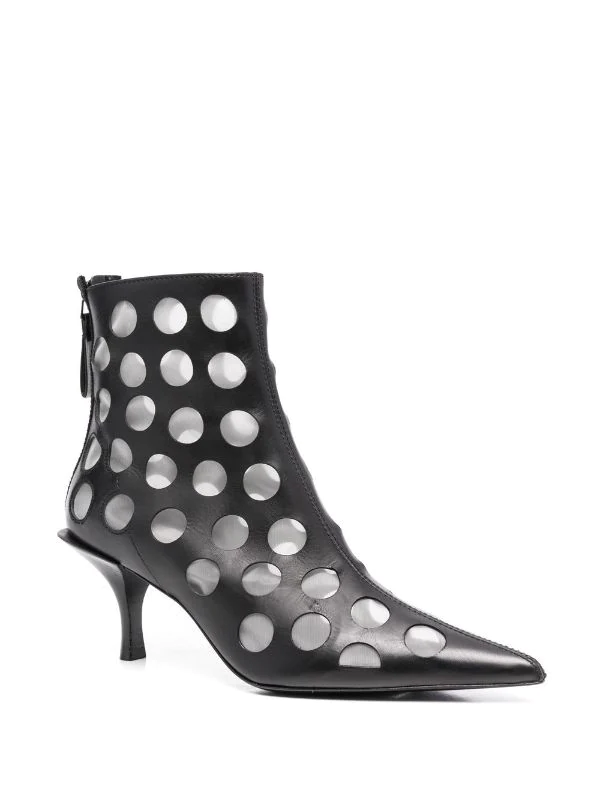 Jet Black, Leder, perforiert, spitze Kappe, knöchelhoch, Reißverschluss hinten, niedriger Trichterabsatz.