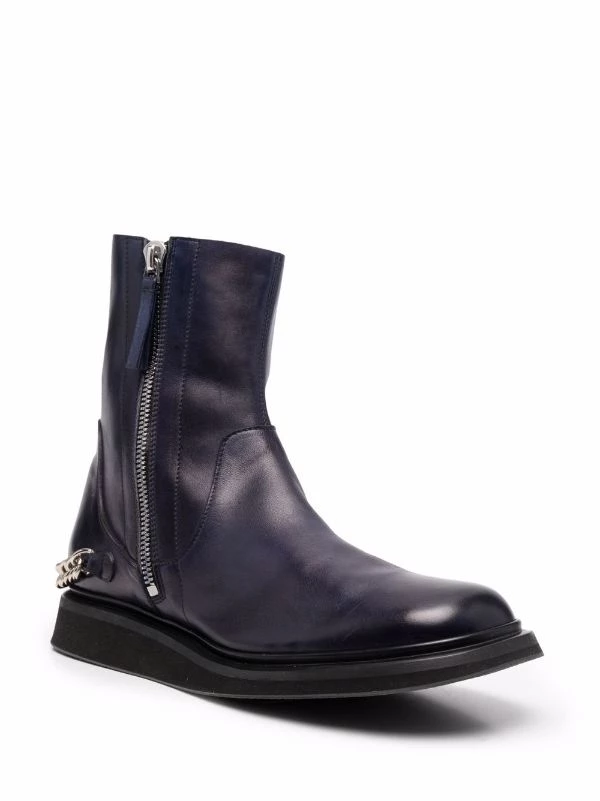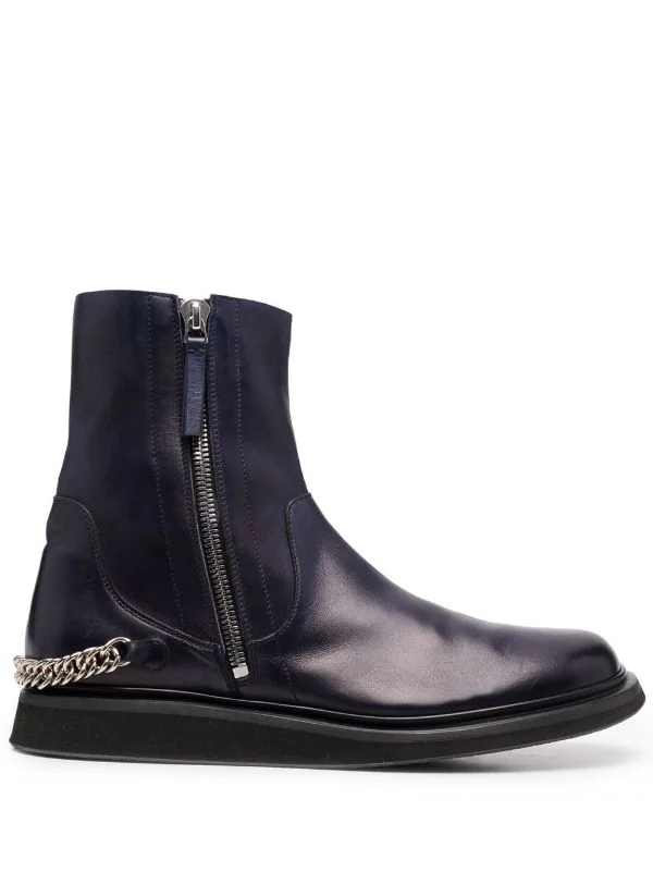 Knöchelhoch, Kettendetails, seitlicher Reißverschluss, runde Kappe, Logo-Prägung im Fußbett, flache Gummisohle. Material: Kalbsleder.