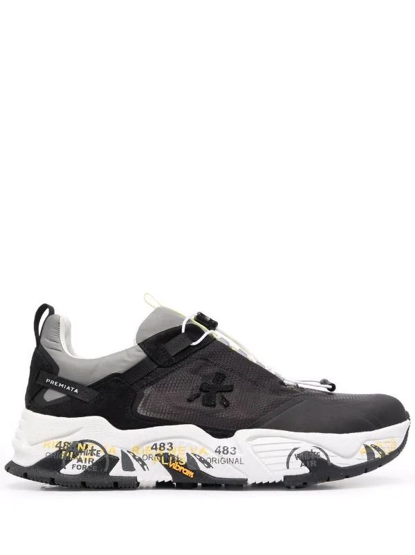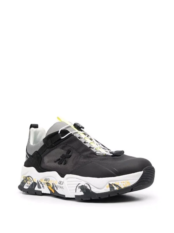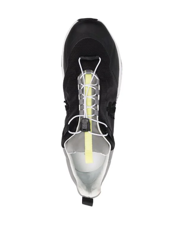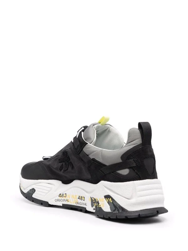 Mesh-Einsätze, Logo-Patch an der Seite, runde Kappe, Lasche an der Ferse, klobige Gummisohle, Sohle mit Logo.