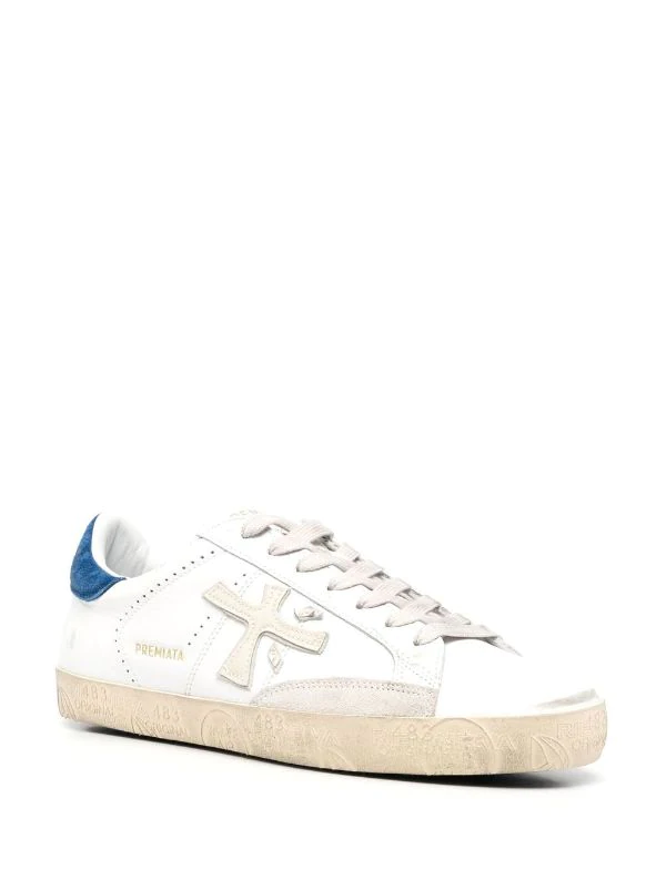 Weiß, Leder, Logo-Patch an der Seite, kontrastierende Fersenkappe, Zunge mit Logo-Print, Logo-Prägung im Fußbett, runde Kappe, Schnürung vorne, flache Gummisohle.