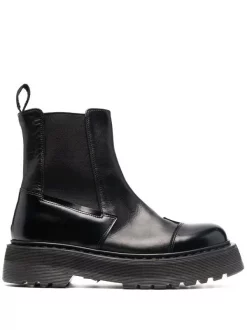 Knöchelhoch, runde Kappe, Stretcheinsätze an den Seiten, Lasche an der Ferse, Logo-Prägung im Fußbett, klobige Gummisohle. Farbe: Schwarz.