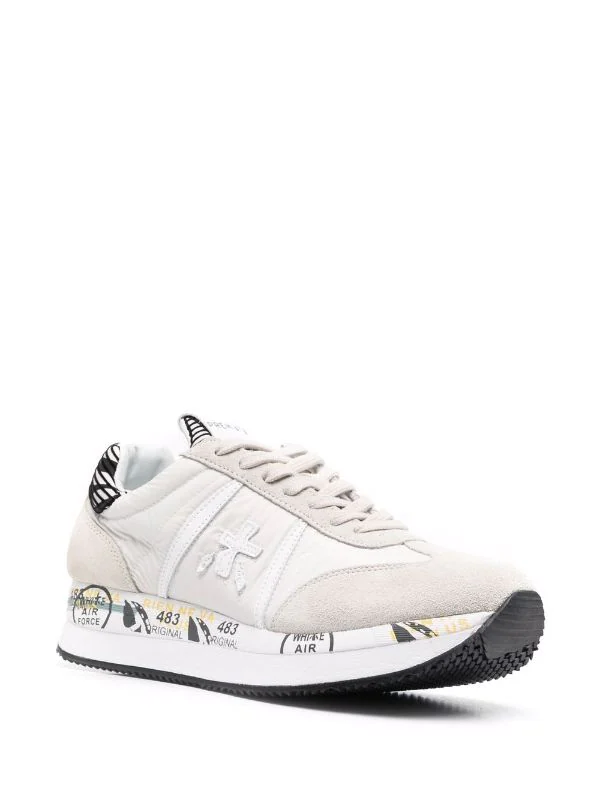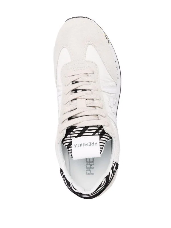 Logo-Patch an der Seite, Logo-Patch an der Zunge, grafischer Print, Kontrastdetails, Schnürung vorne, runde Kappe, flache Gummisohle. Material: Leder.