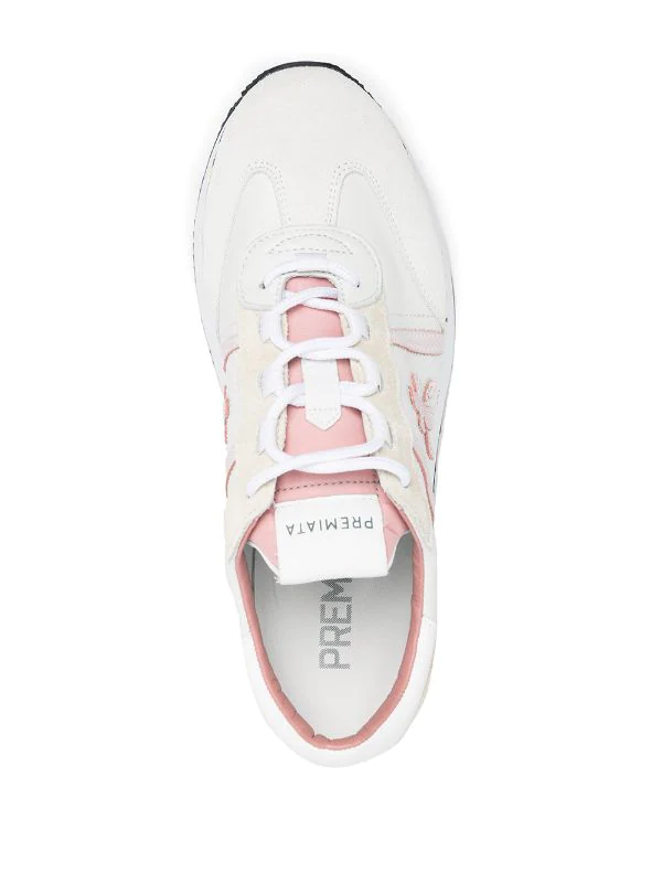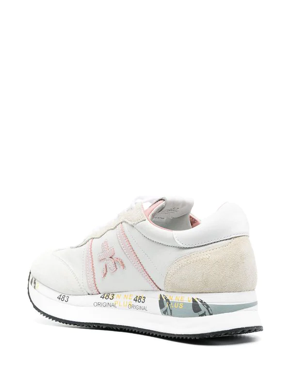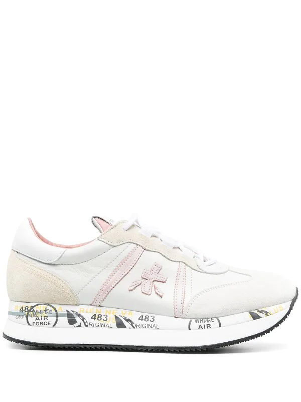 Pleateausohle, Logo-Patch an der Seite, Logo-Patch an der Zunge, runde Kappe, Schnürung vorne, Logo-Prägung im Fußbett. Farbe: Weiß.