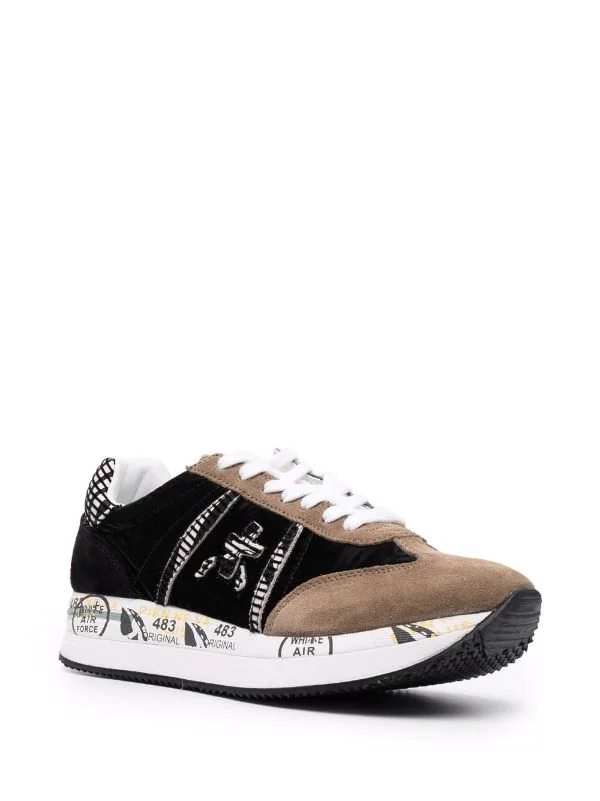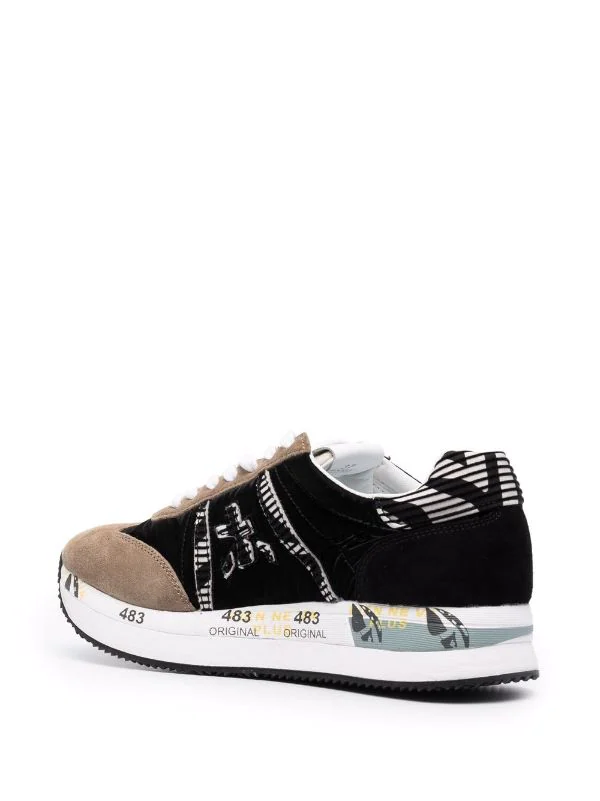 Runde Kappe, Schnürung vorne, Logo-Patch an der Zunge, Logo-Patch an der Seite, Logo-Prägung im Fußbett, Sohle mit Logo, Pleateausohle. Material: Leder.
