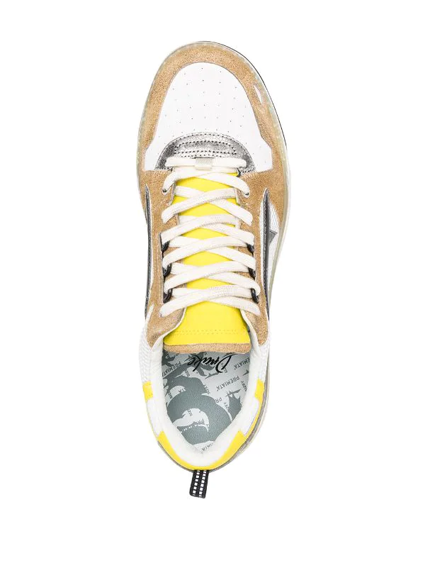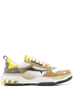 Lasche an der Ferse, Schnürung vorne, flache Gummisohle, runde Kappe, Colour-Block-Design.