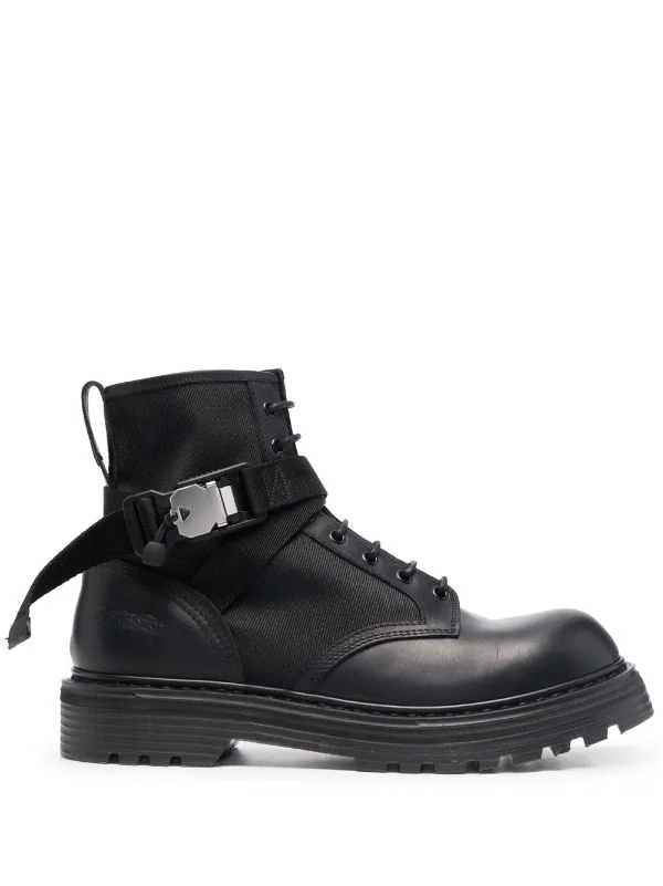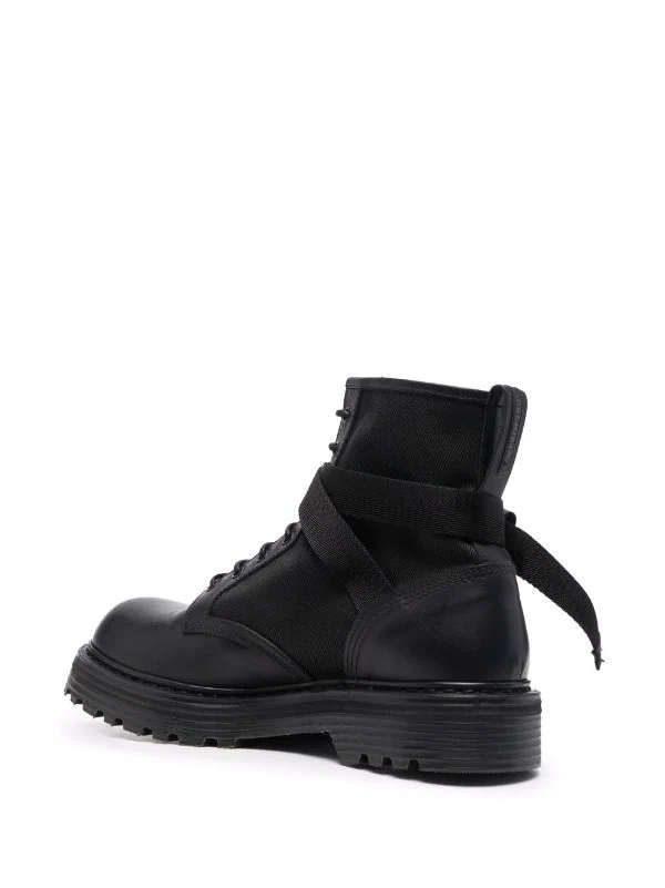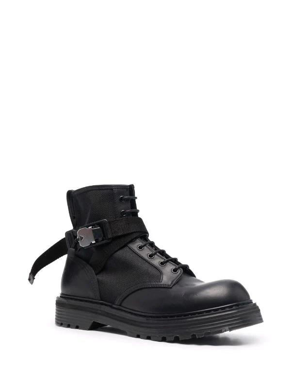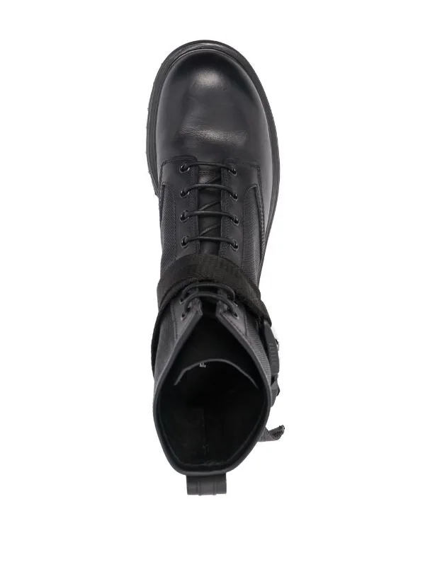 Seitliche Logo-Prägung, runde Kappe, Schnürung vorne, Knöchelriemen, knöchelhoch, Lasche an der Ferse, flache Gummisohle. Farbe: Schwarz. Material: Kalbsleder.
