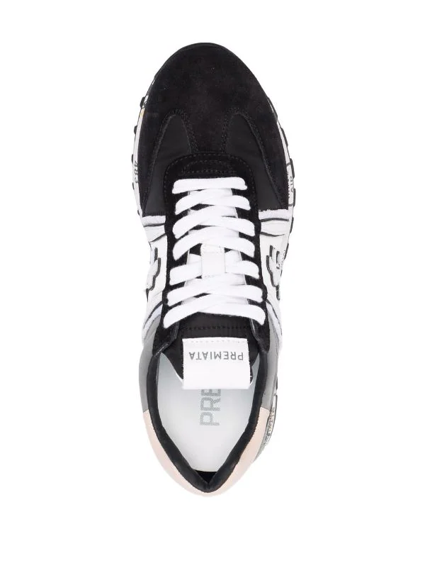 Kontrastdetails, Logo-Patch an der Seite, Logo-Patch an der Zunge, mandelförmige Kappe, Schnürung vorne, Logo-Prägung im Fußbett, Sohle mit Nieten. Material: Leder.
