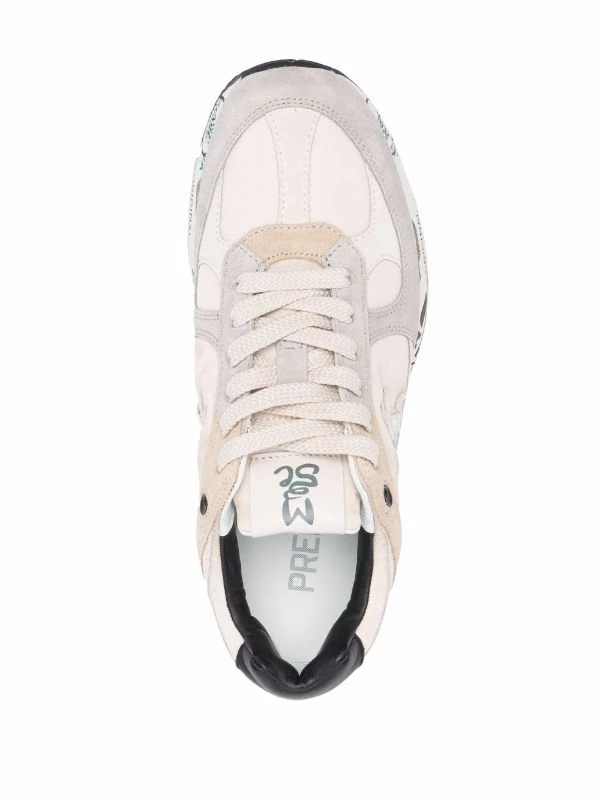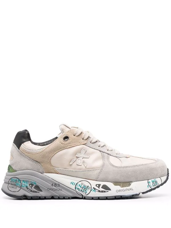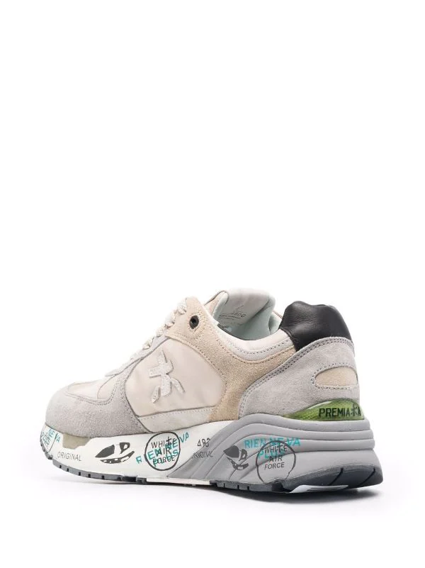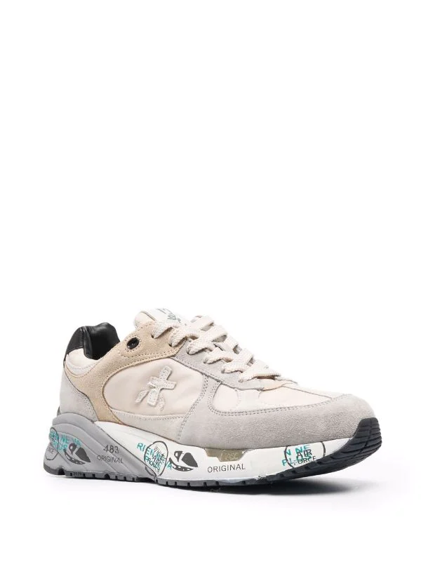 Beige, Kalbsleder, seitlicher Logo-Print, Logo-Patch an der Zunge, Kontrastdetails, Schnürung vorne, runde Kappe, flache Gummisohle, Logo-Prägung im Fußbett.