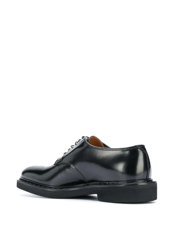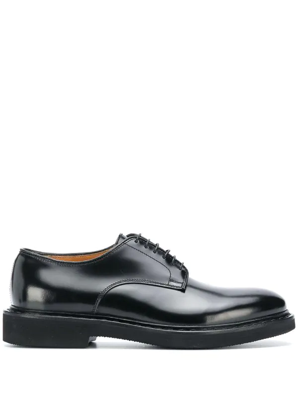 Mandelförmige Kappe, Schnürung vorne, Logo-Prägung im Fußbett, niedriger Absatz, Gummisohle. Material: Leder.