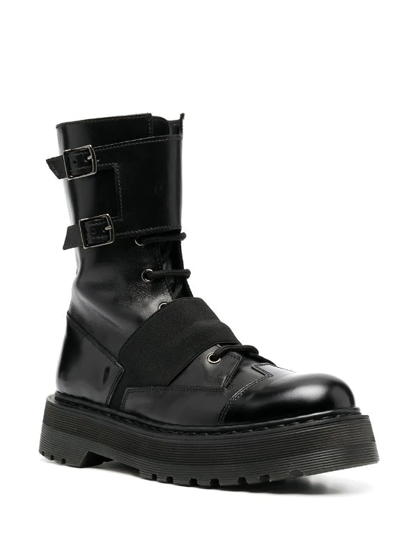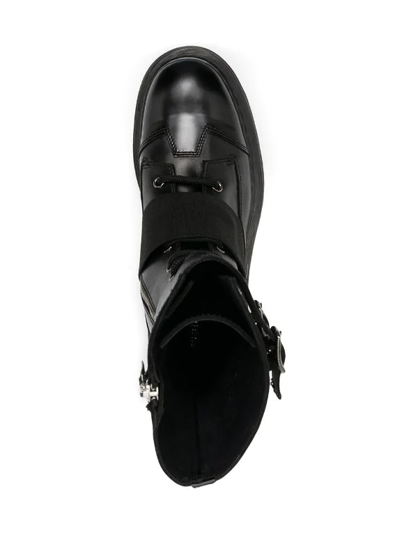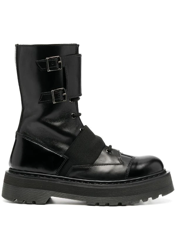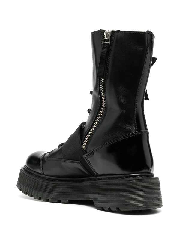 Klobige Gummisohle, Schnürung vorne, runde Kappe, poliertes Finish, Doppelschnalle, seitlicher Reißverschluss. Farbe: Schwarz. Material: Leder.