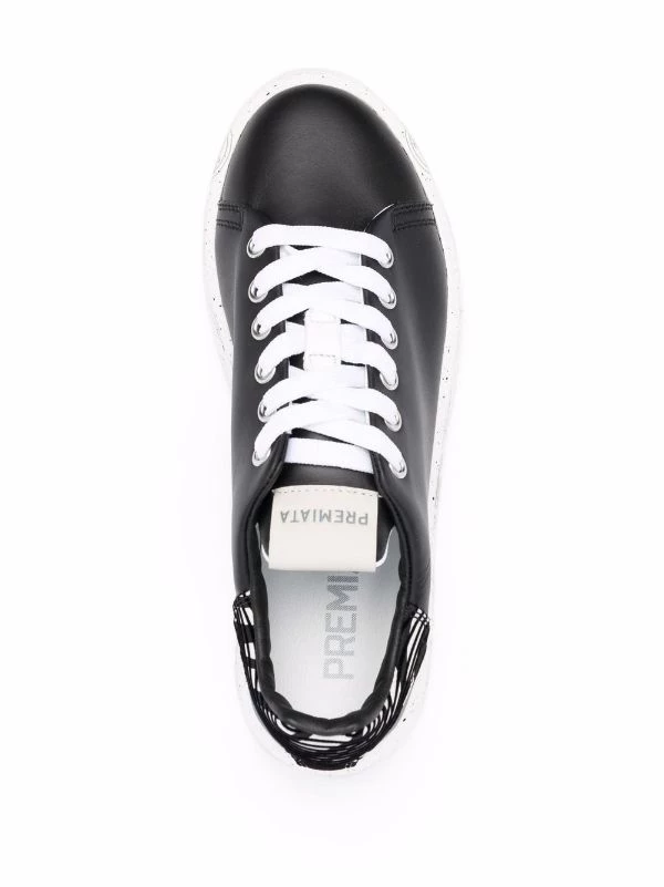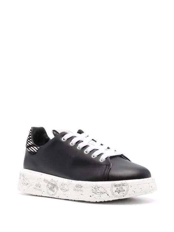 Schnürung vorne, flache Gummisohle, runde Kappe. Farbe: Schwarz. Material: Leder.