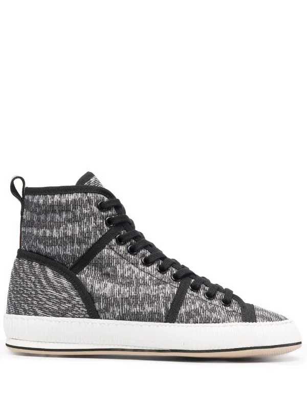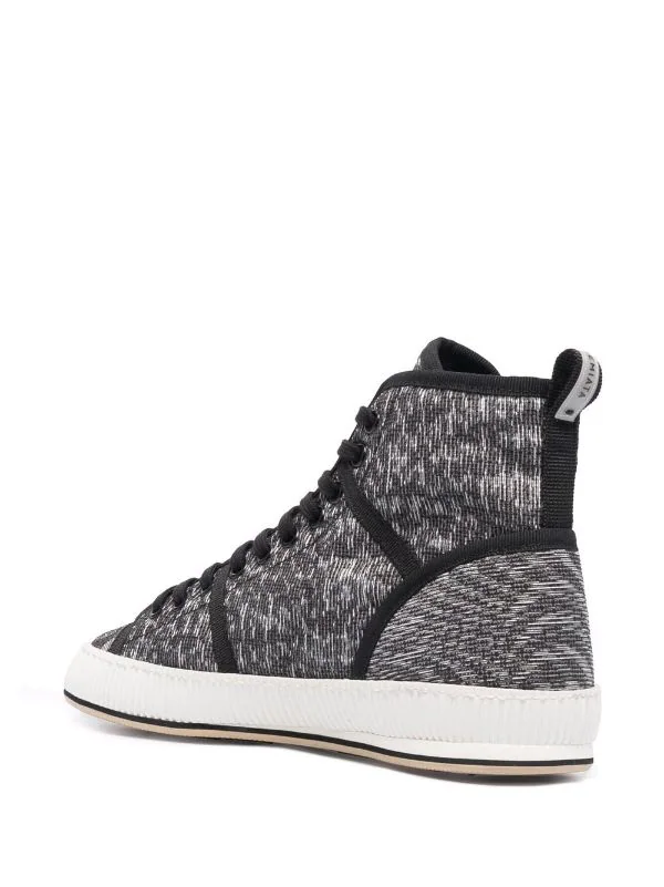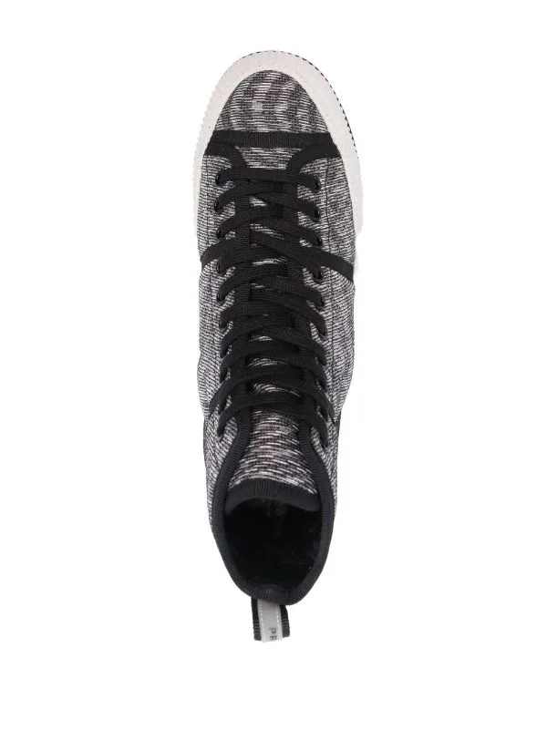 Schwarz, Leder, mit Webmuster, Schnürung vorne, runde Kappe, flache Gummisohle, Logo-Prägung im Fußbett.
